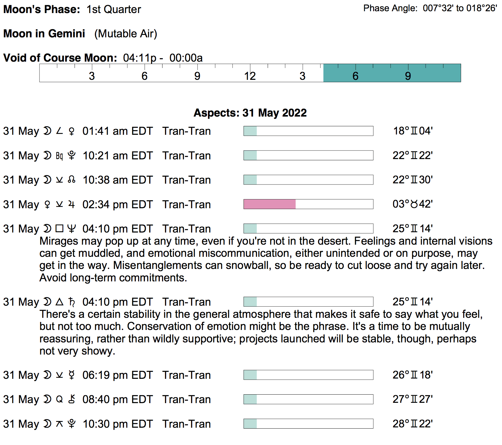 Planet Color Key: The longer the bar, the slower the aspecting planet, and the longer the duration of the planet’s transit.