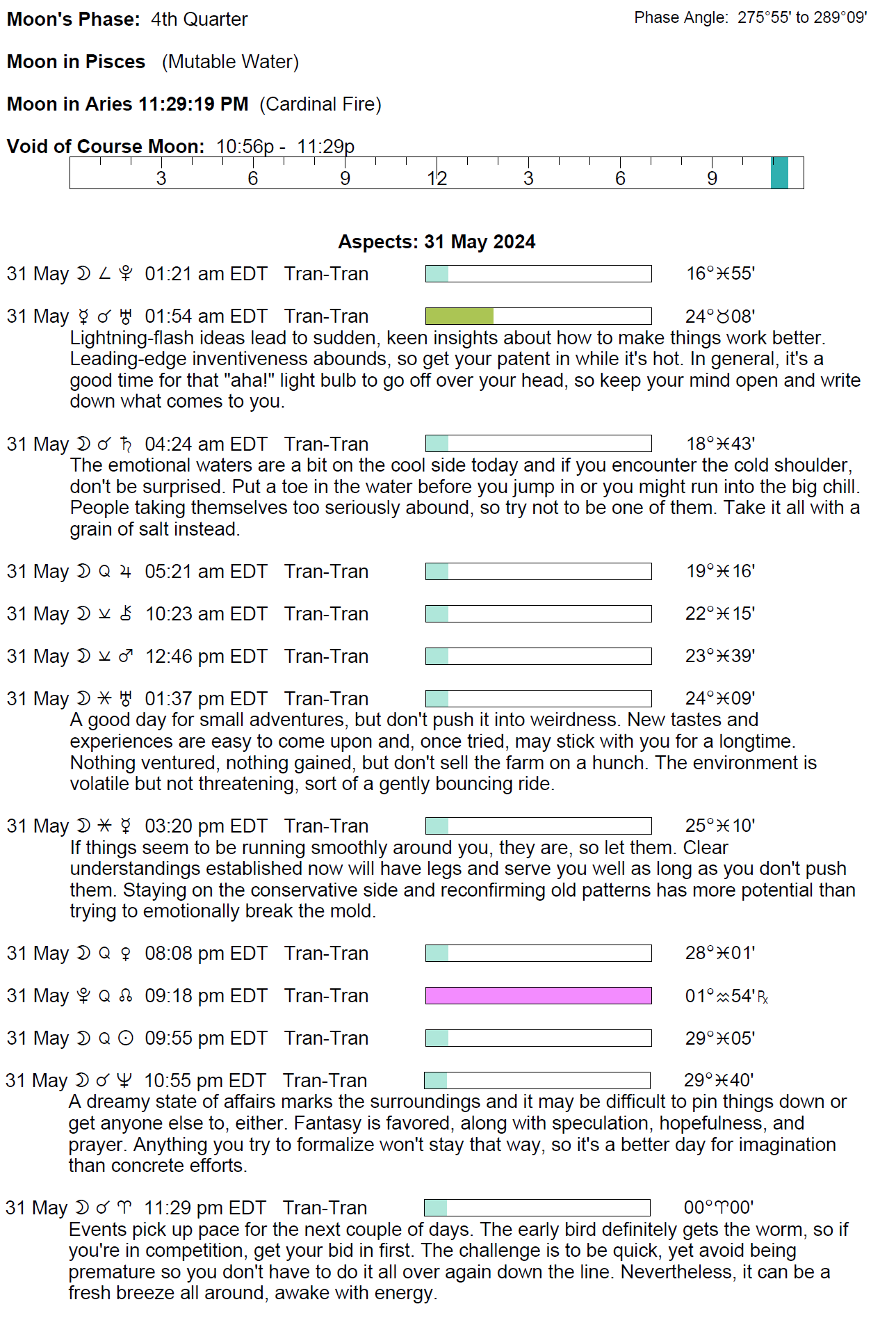 Planet Color Key: The longer the bar, the slower the aspecting planet, and the longer the duration of the planet’s transit.