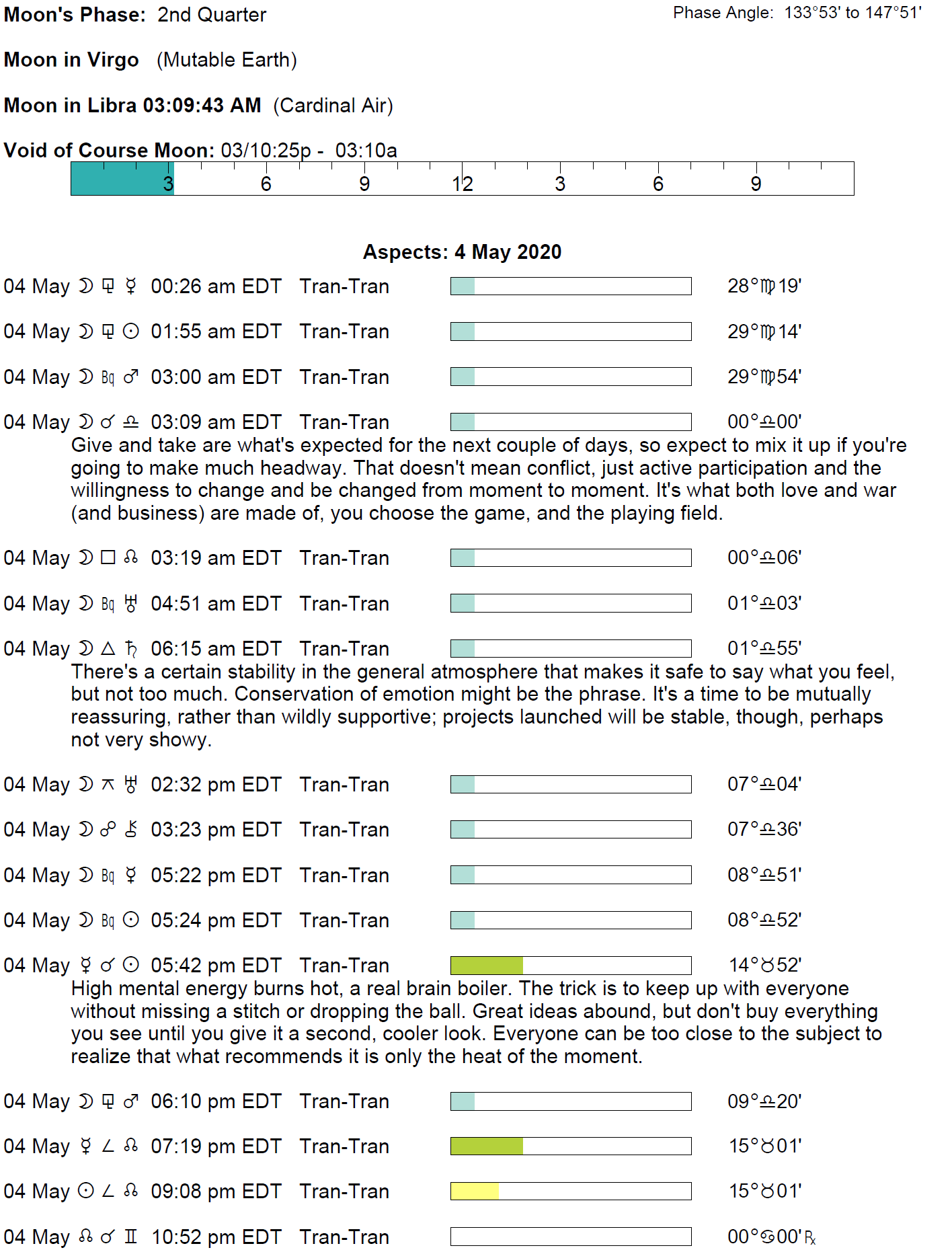 Planet Color Key: The longer the bar, the slower the aspecting planet and the longer the duration of the planet’s transit.