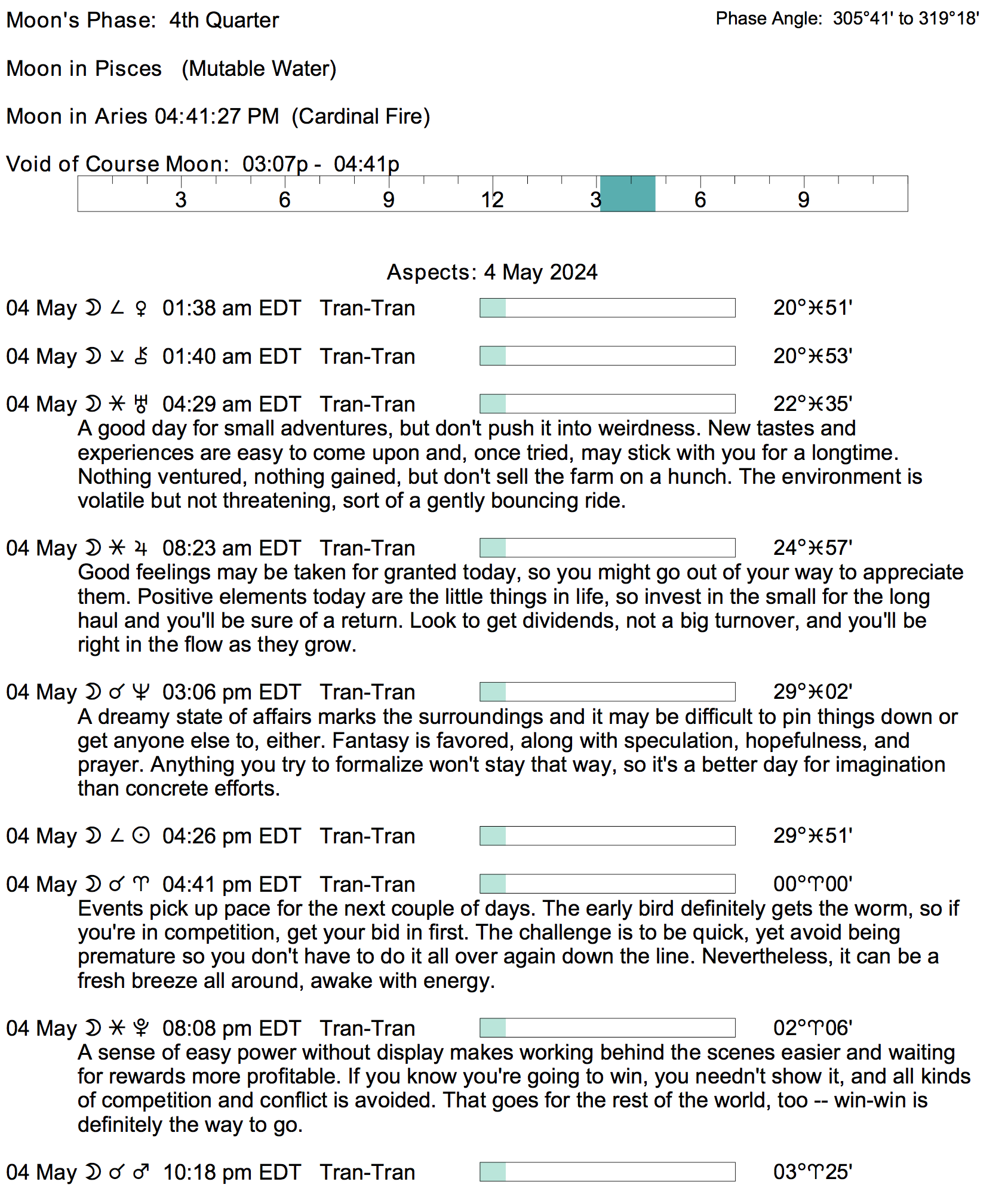 - A void Moon period occurs from 3:05 PM to 4:40 PM today.