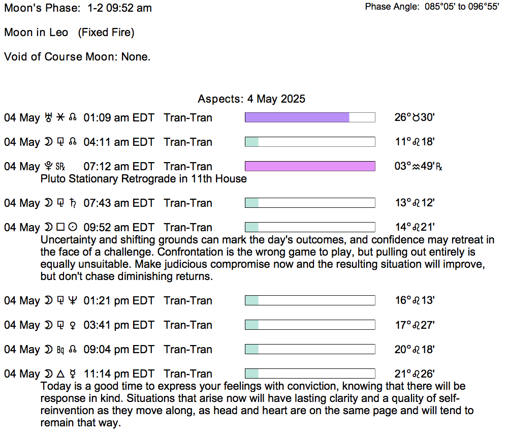 Planet Color Key: The longer the bar, the slower the aspecting planet, and the longer the duration of the planet’s transit.