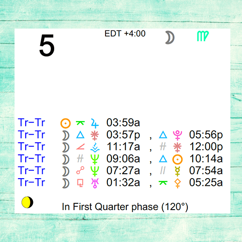The following aspects (major only) and positions are at noon (EDT) on May 5th: