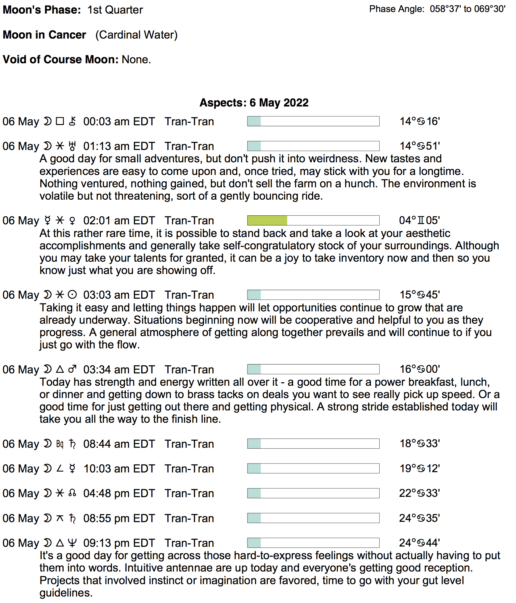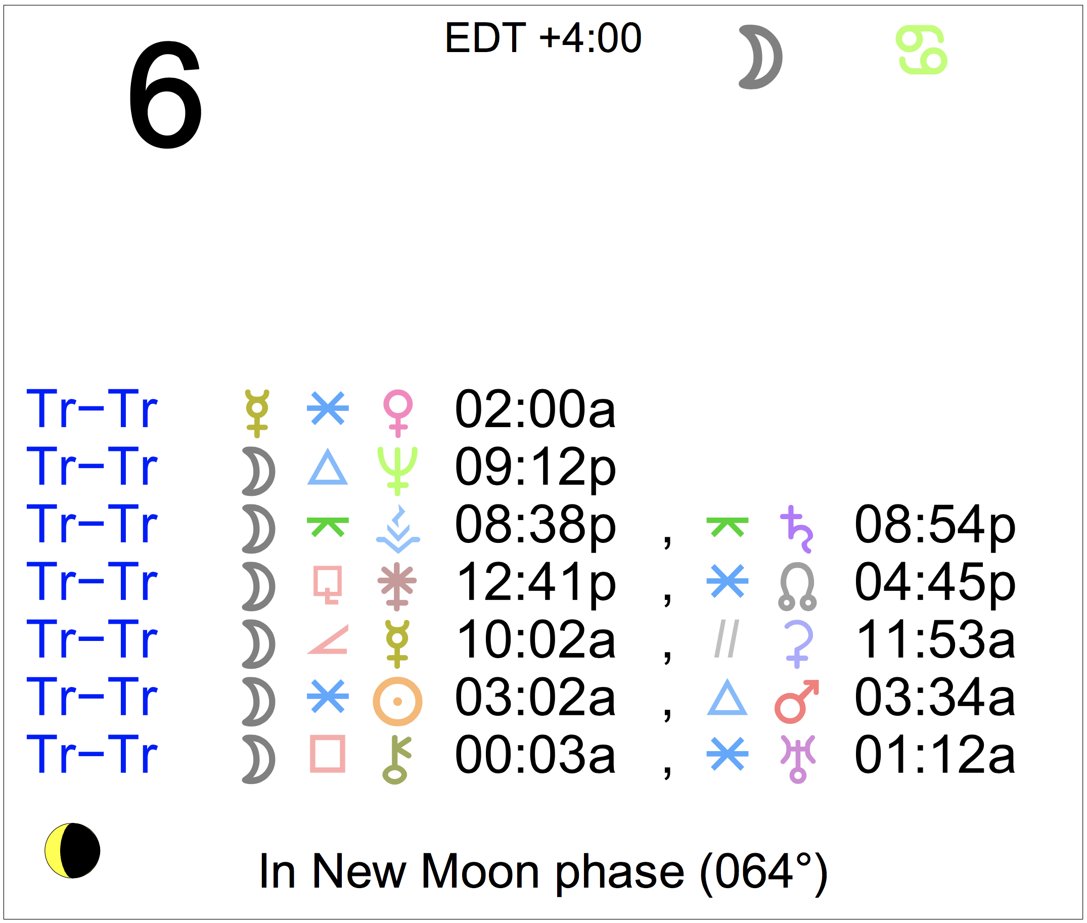 Planet Color Key: The longer the bar, the slower the aspecting planet, and the longer the duration of the planet’s transit.