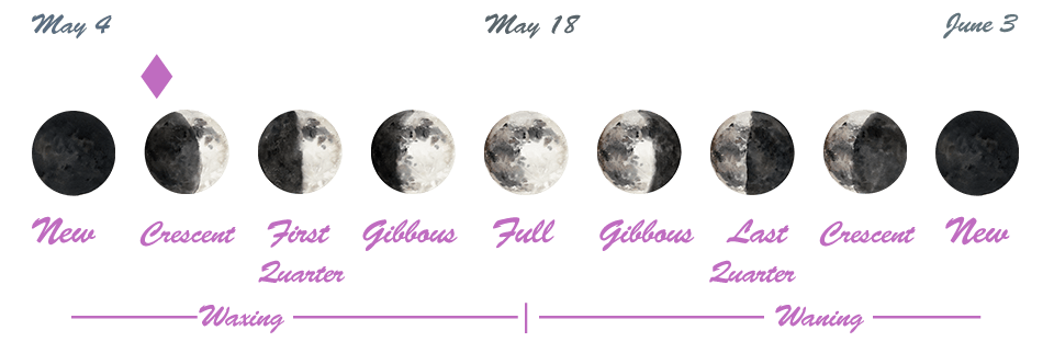 - We are in between the New Moon that occurred on May 4th in the sign of Taurus, and the First Quarter Moon, which will happen on May 11th.