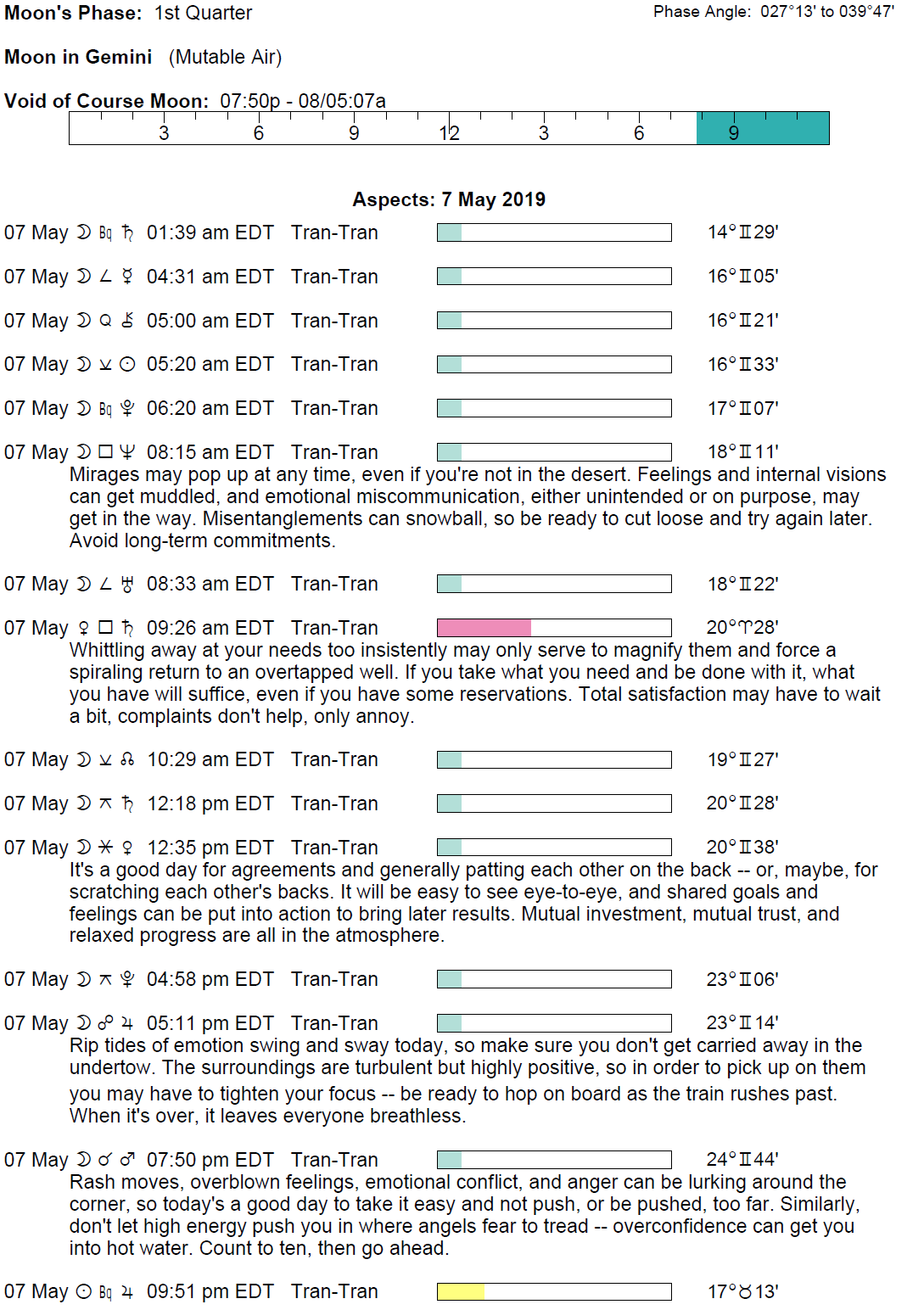 Planet Color Key: The longer the bar, the slower the aspecting planet and the longer the duration of the planet’s transit.