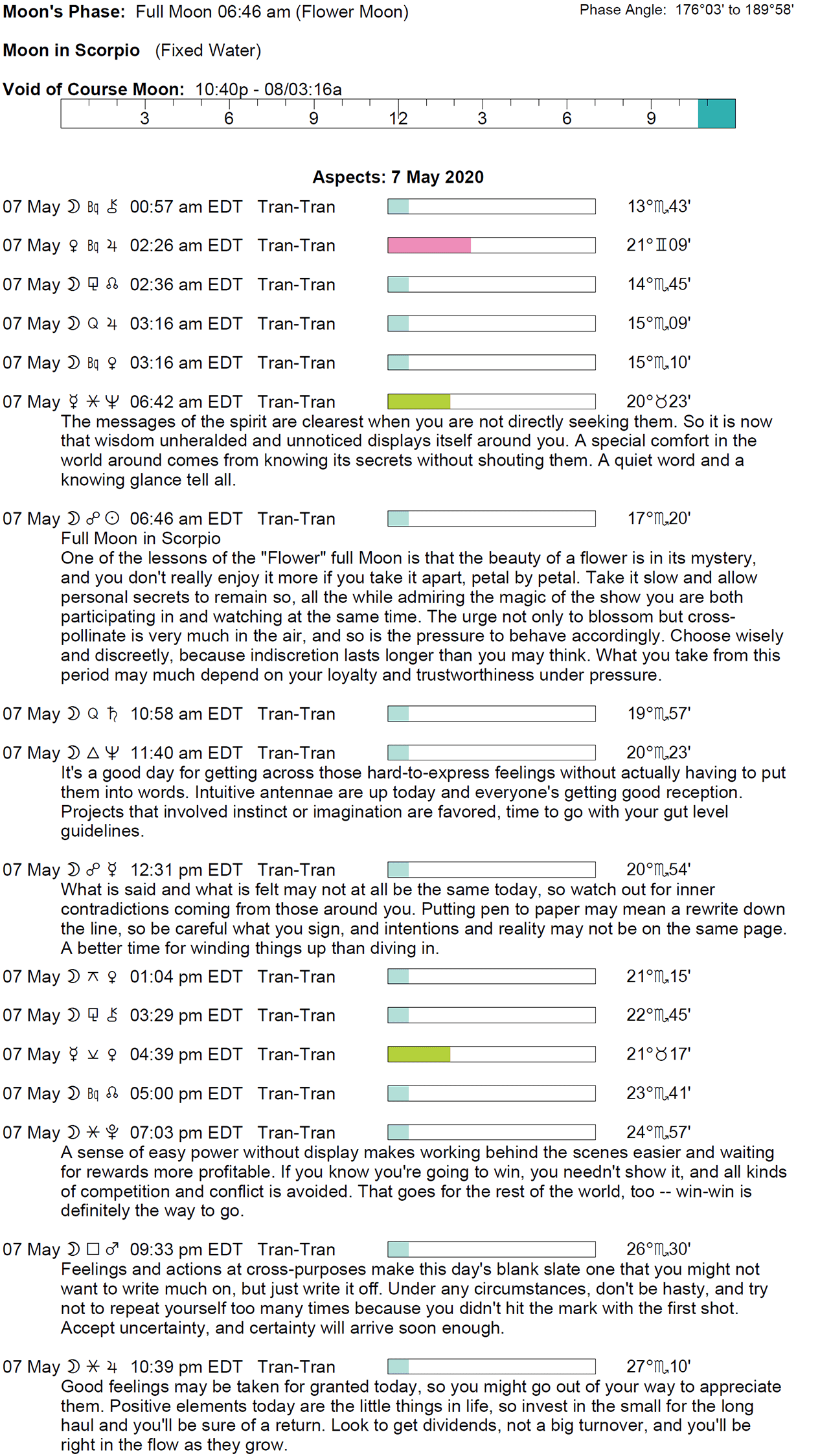 Planet Color Key: The longer the bar, the slower the aspecting planet and the longer the duration of the planet’s transit.