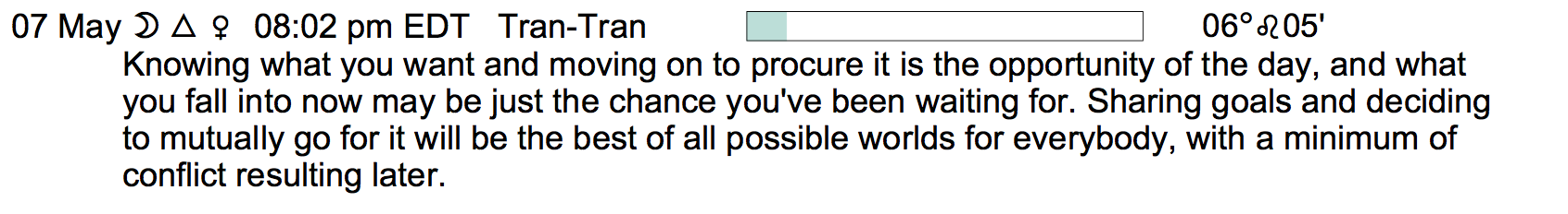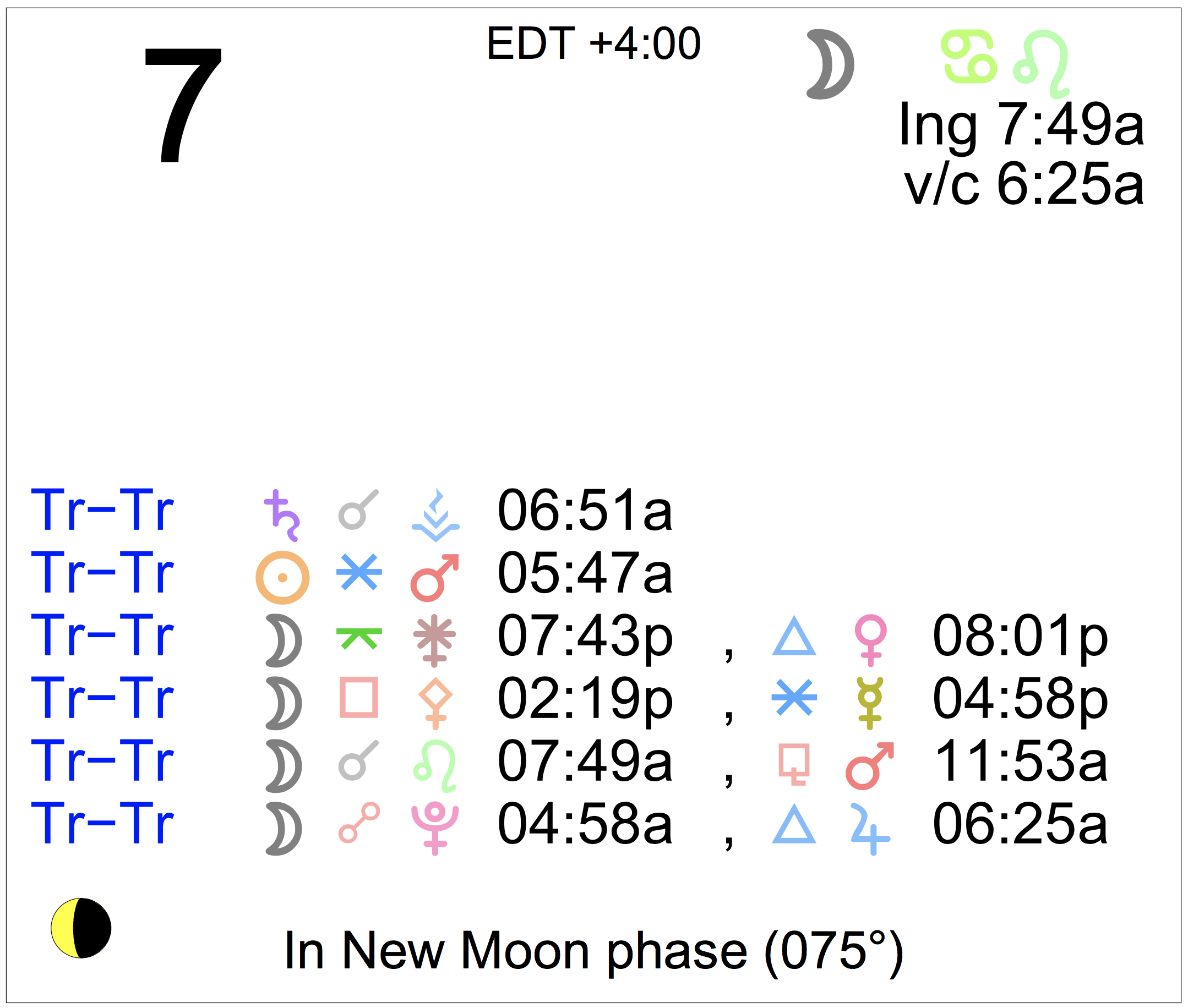 Planet Color Key: The longer the bar, the slower the aspecting planet, and the longer the duration of the planet’s transit.