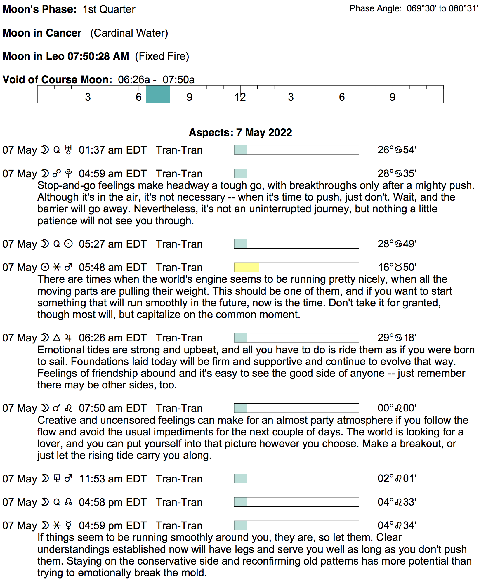 - A void Moon period occurs from 6:25 AM to 7:49 AM today.