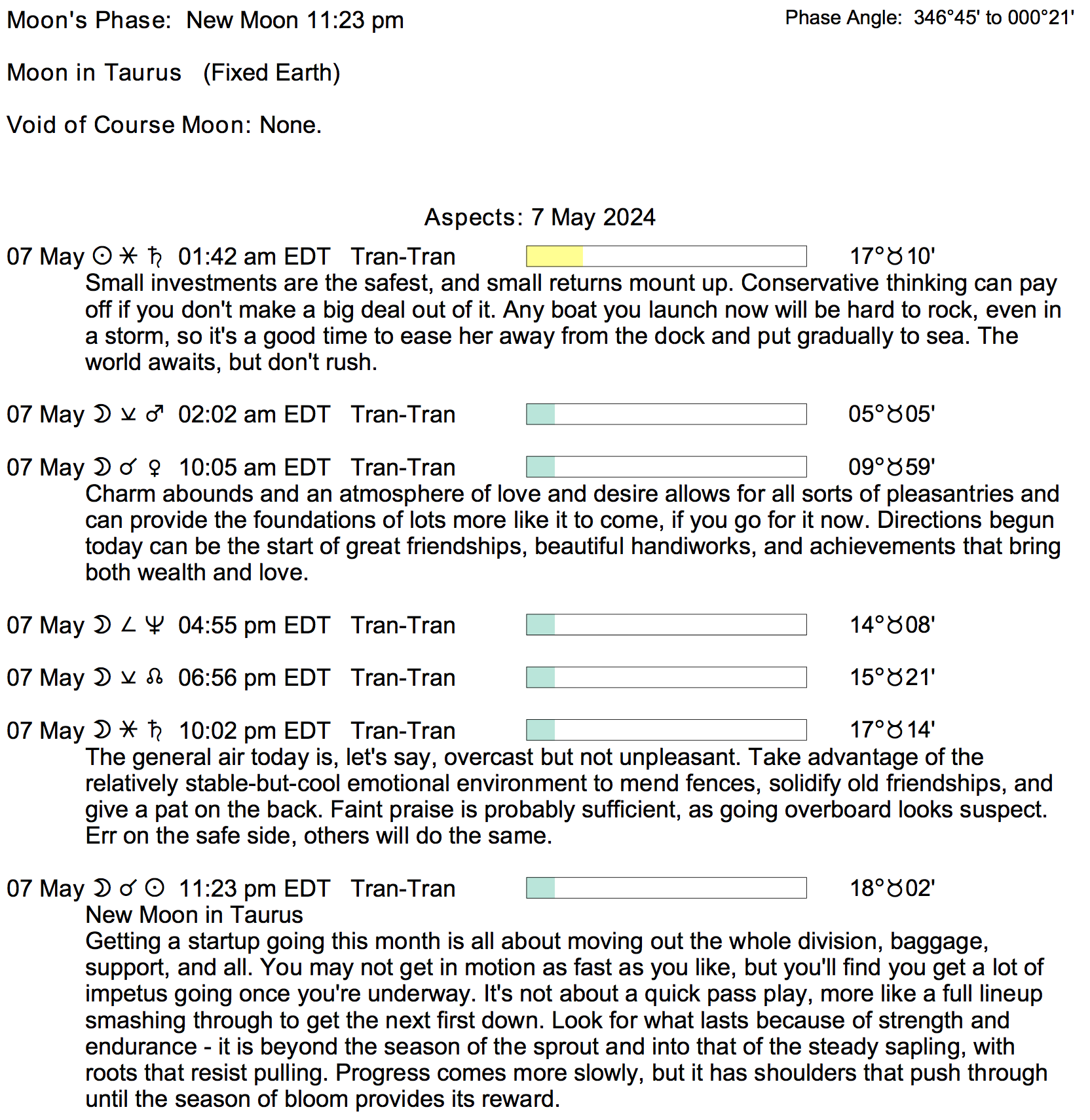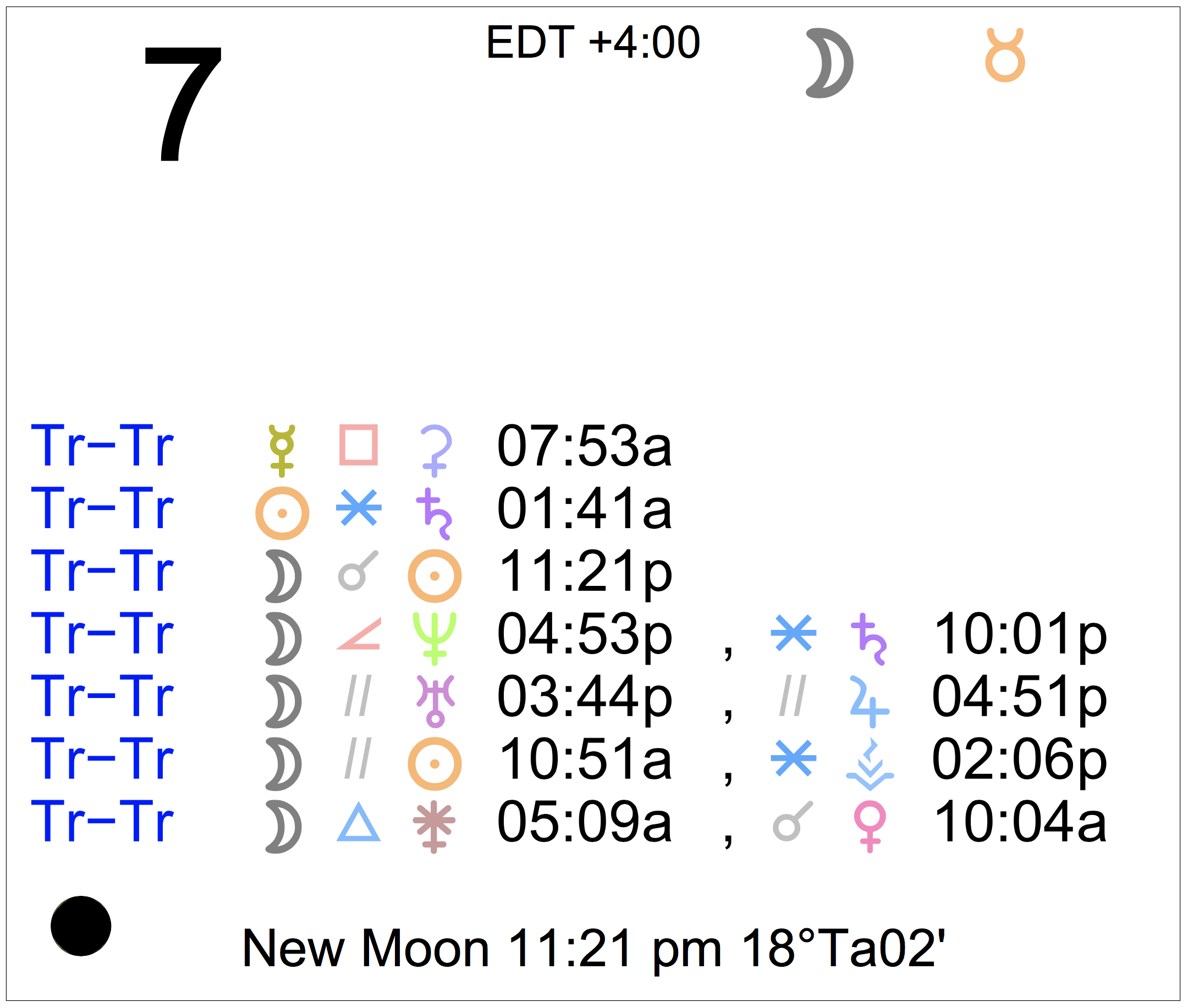 - The New Moon occurs tonight in the sign of Taurus at 11:21 PM.