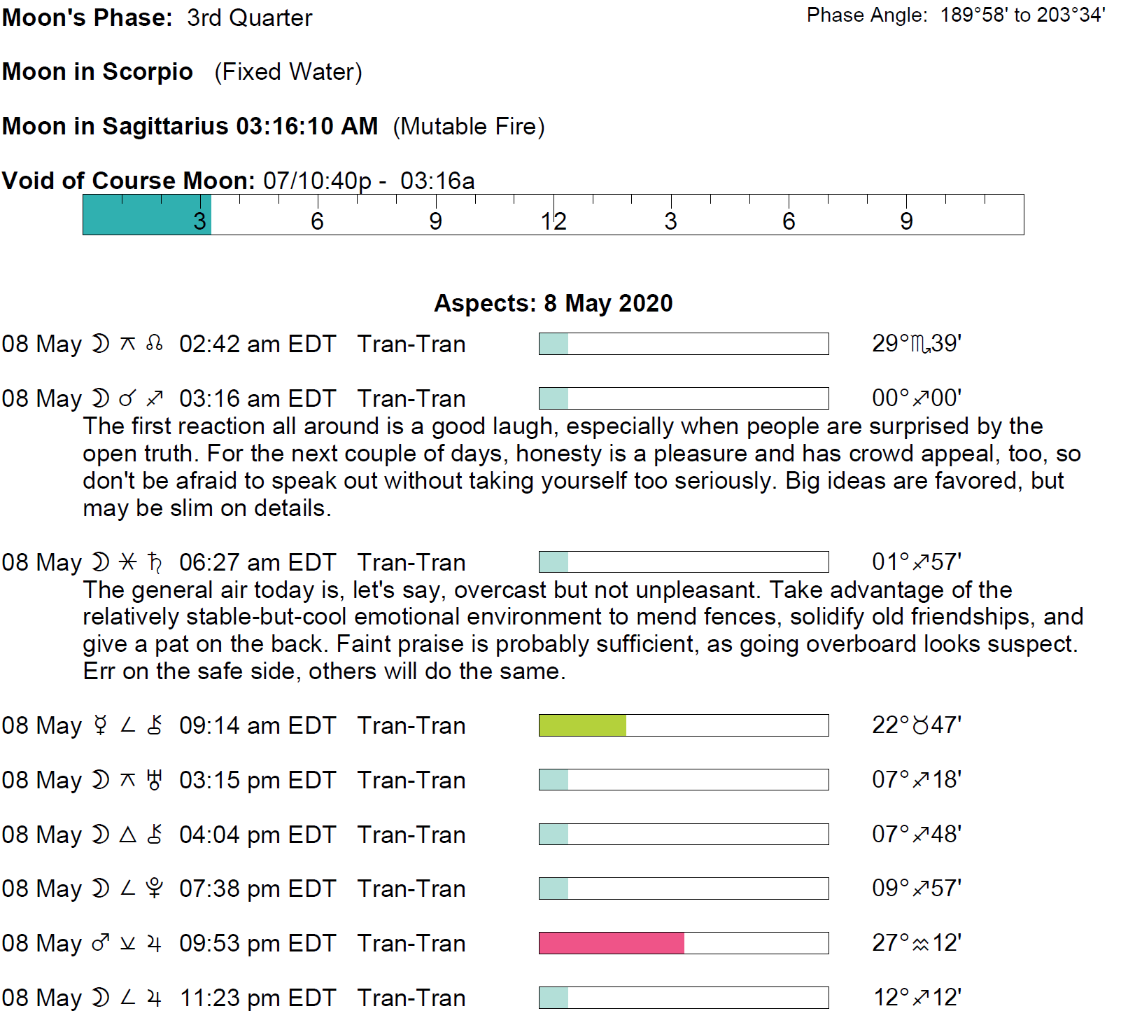 Planet Color Key: The longer the bar, the slower the aspecting planet and the longer the duration of the planet’s transit.