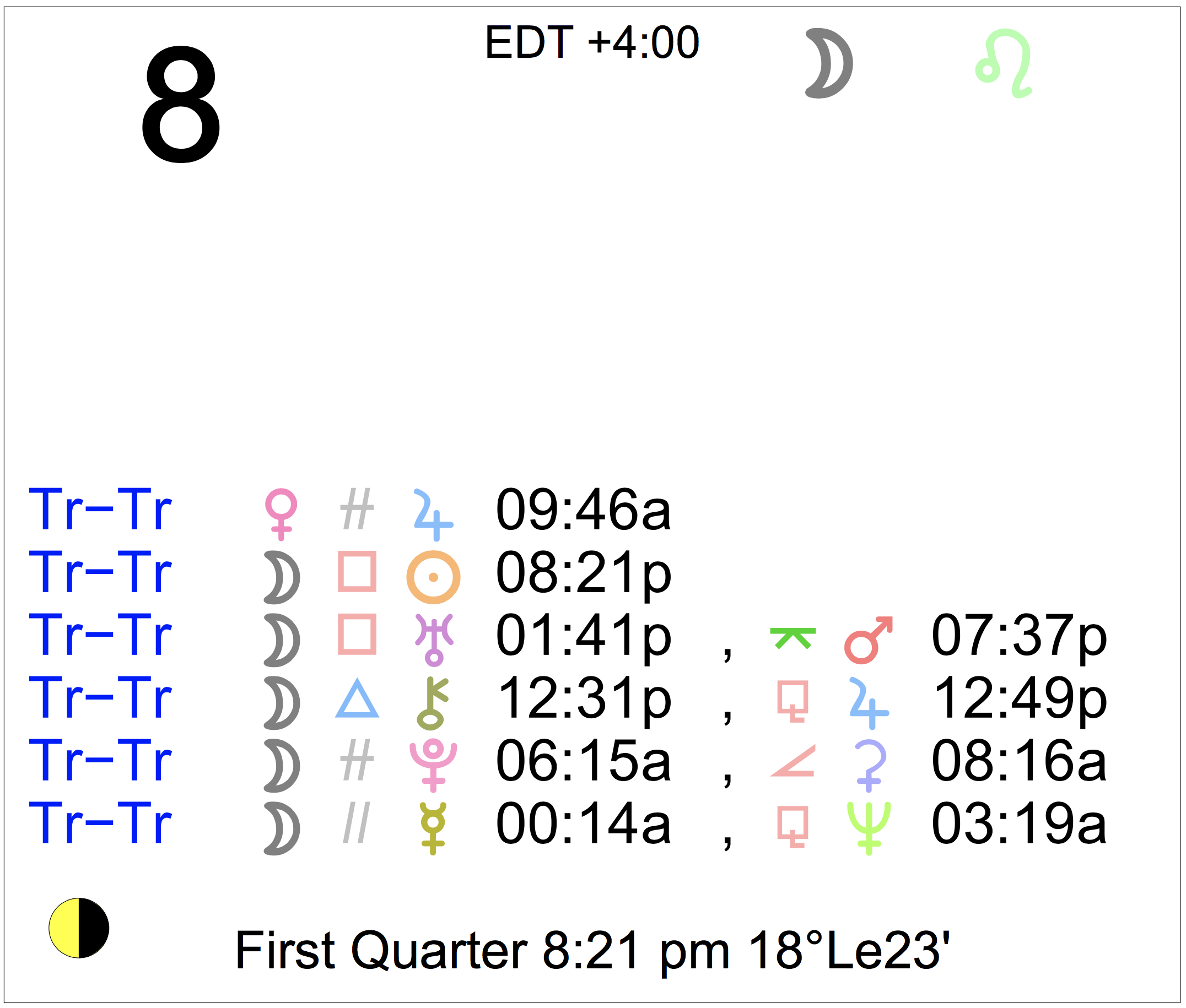 Planet Color Key: The longer the bar, the slower the aspecting planet, and the longer the duration of the planet’s transit.