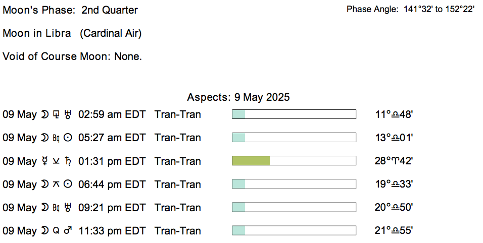 Planet Color Key: The longer the bar, the slower the aspecting planet, and the longer the duration of the planet’s transit.