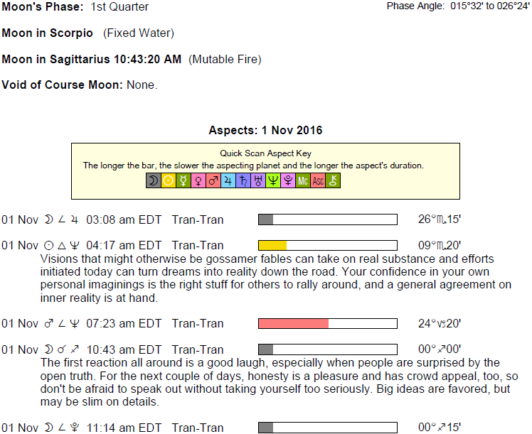 The following aspects (major only) and positions are at noon (EDT) on November 1st: