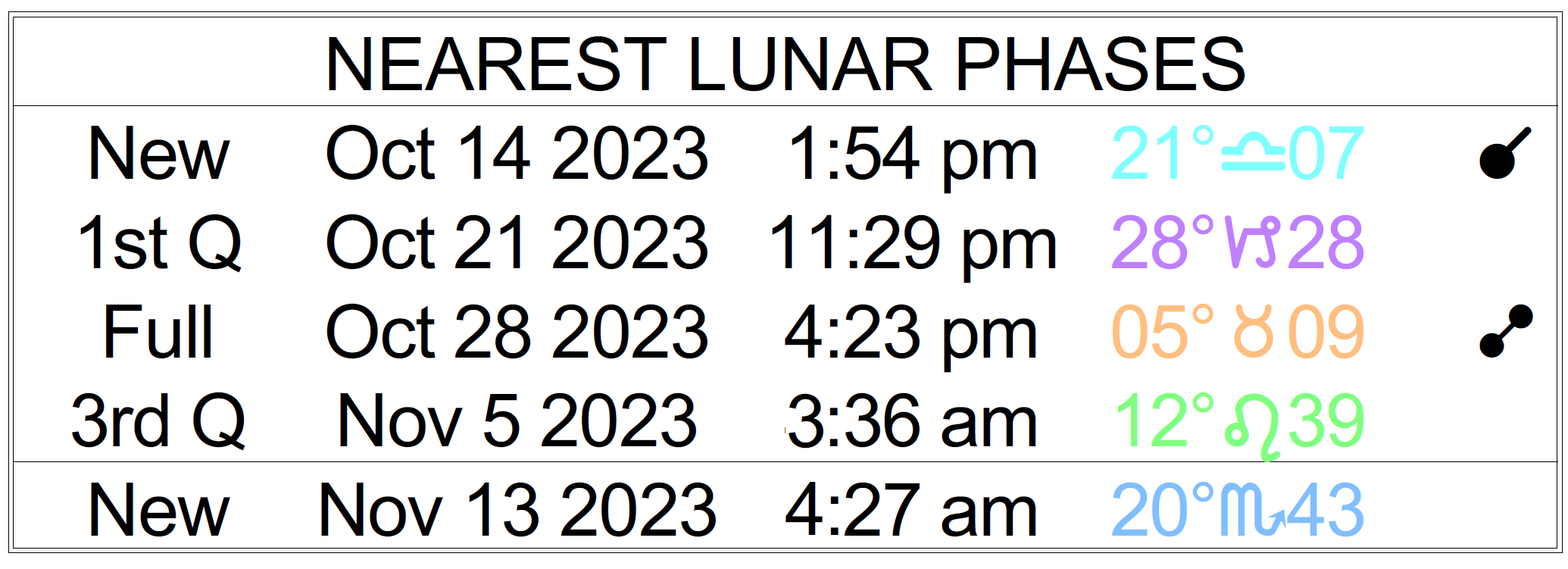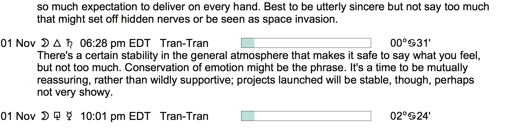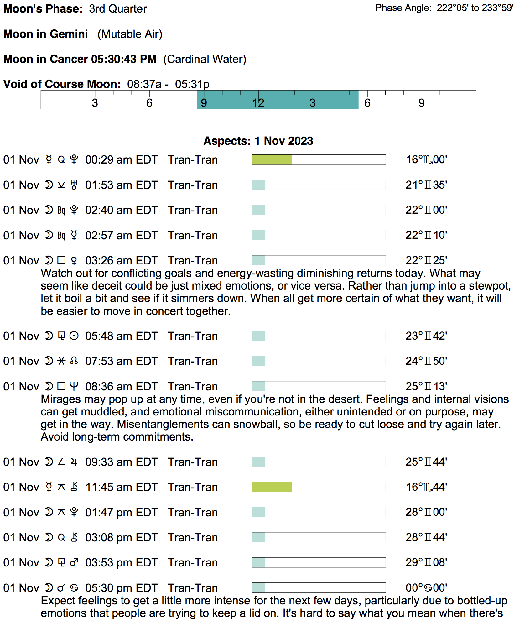 Planet Color Key: The longer the bar, the slower the aspecting planet, and the longer the duration of the planet’s transit.