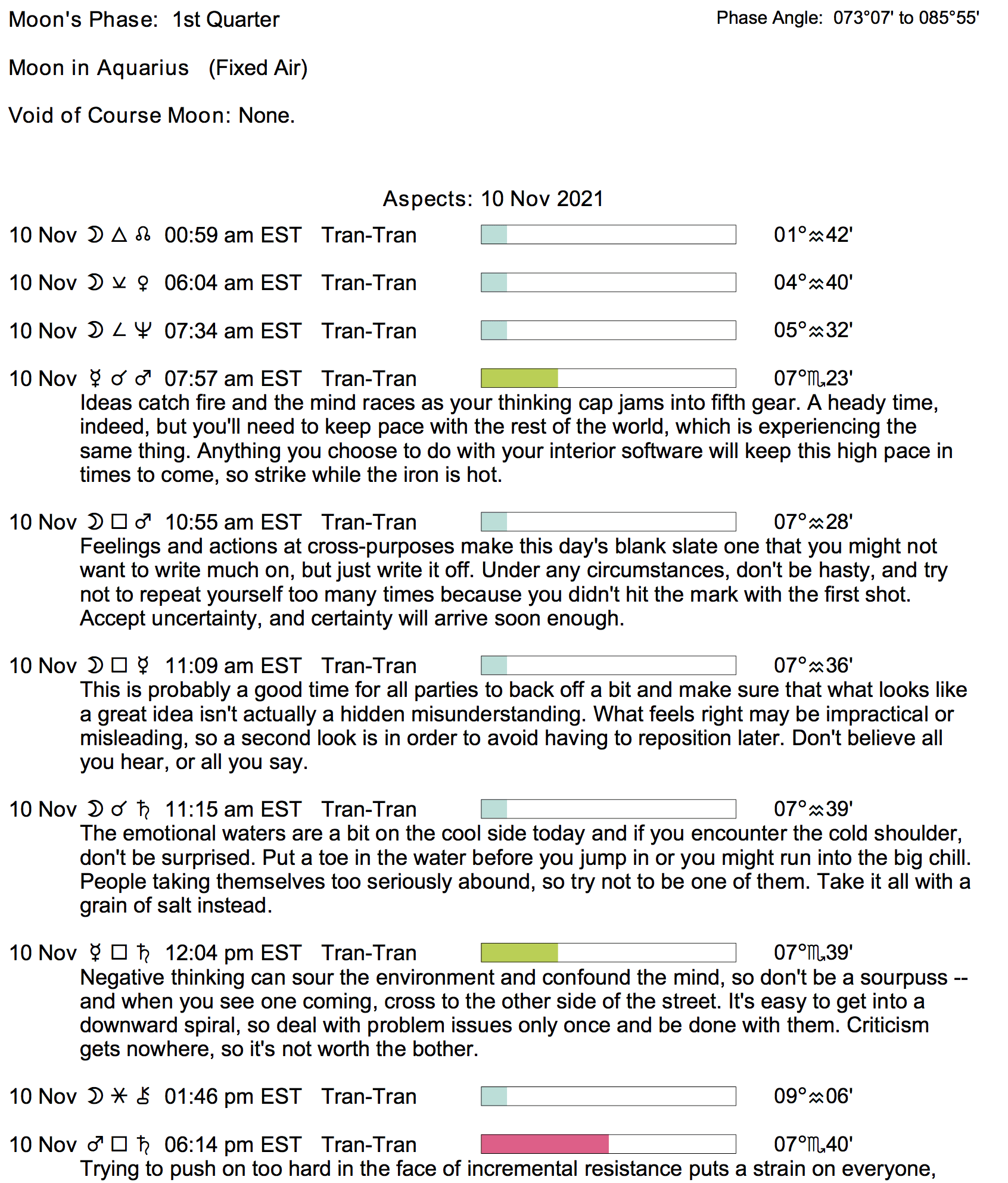 Planet Color Key: The longer the bar, the slower the aspecting planet, and the longer the duration of the planet’s transit.