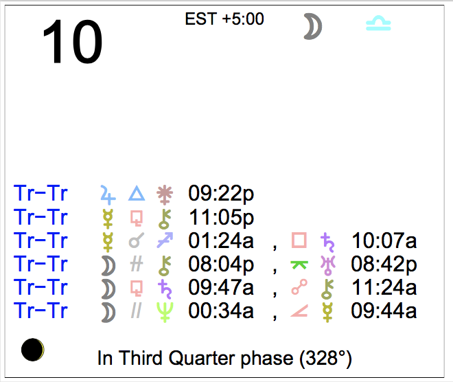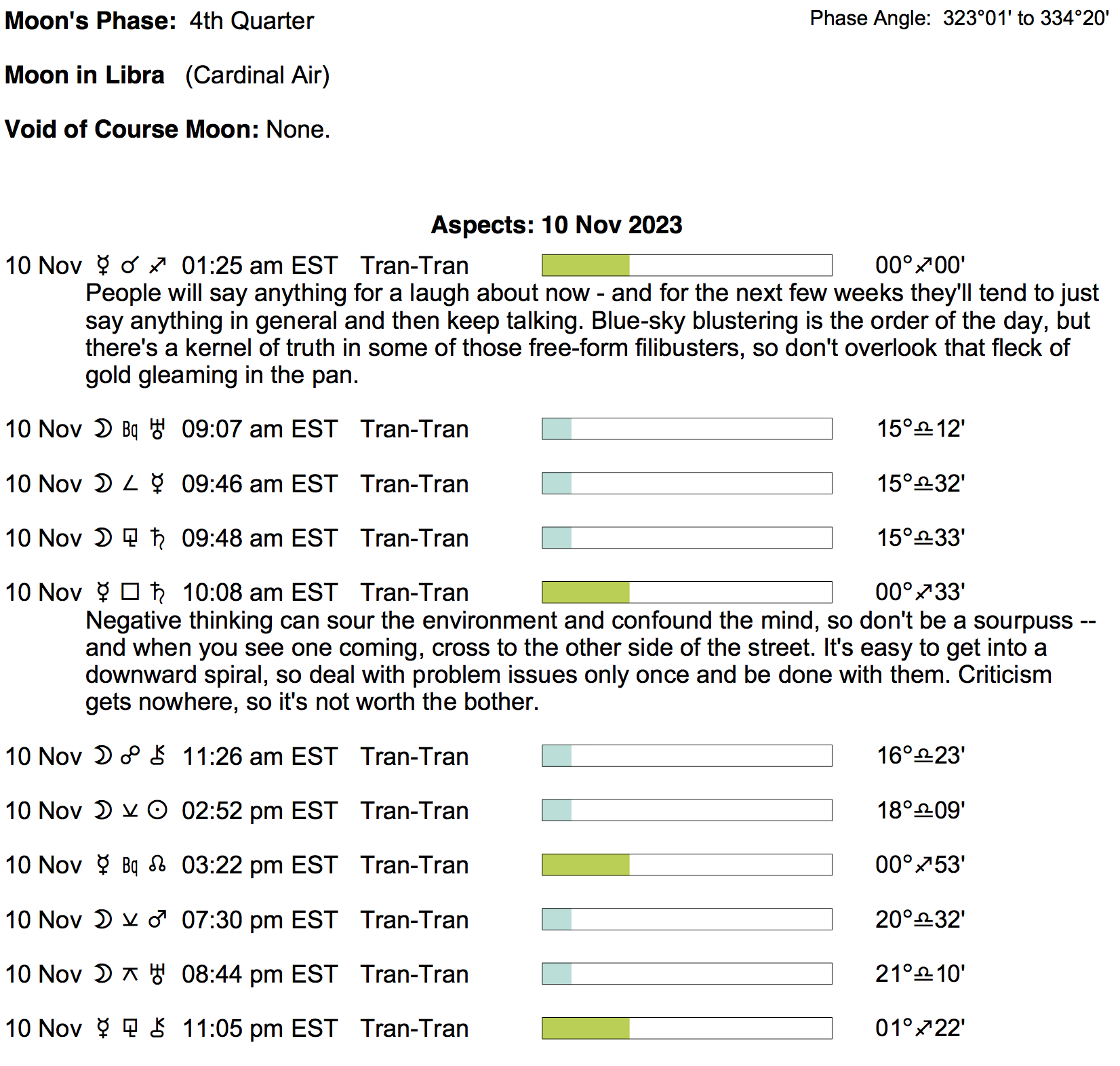 Planet Color Key: The longer the bar, the slower the aspecting planet, and the longer the duration of the planet’s transit.