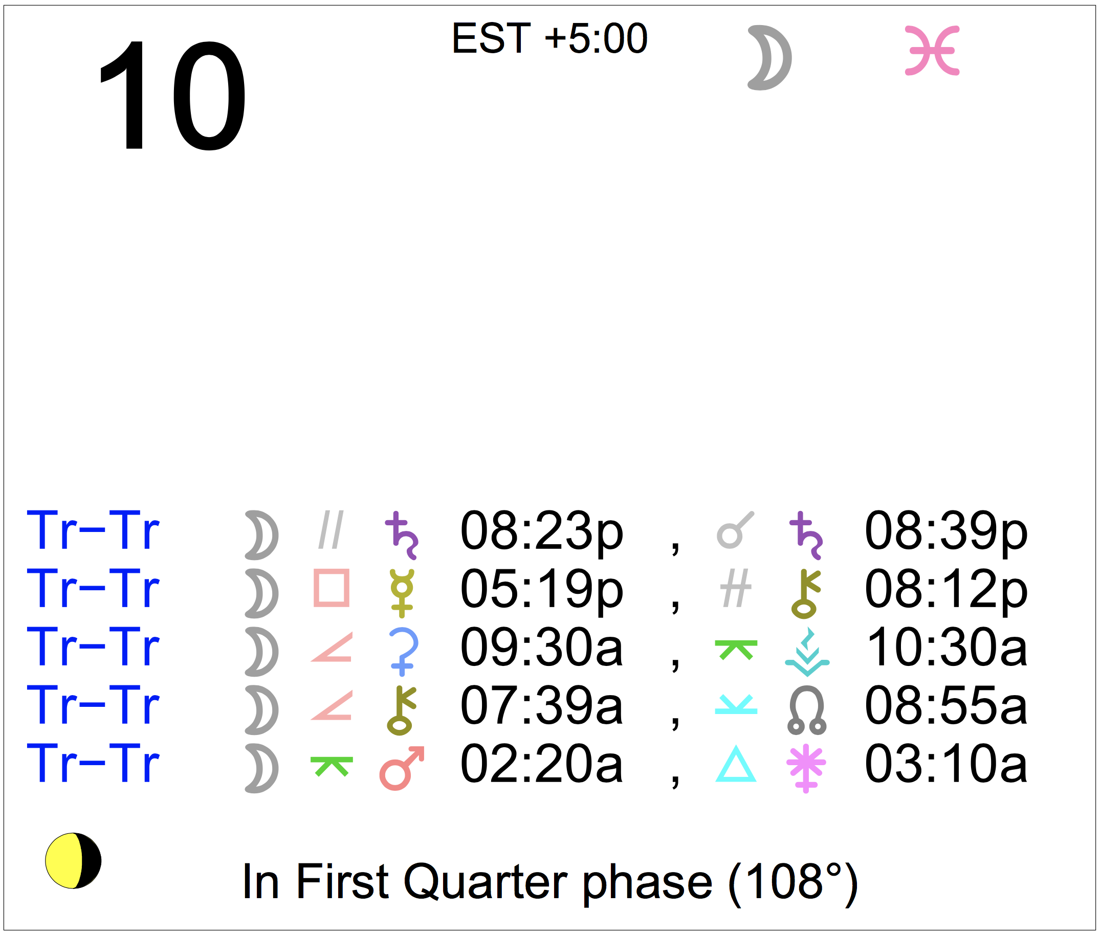 Planet Color Key: The longer the bar, the slower the aspecting planet, and the longer the duration of the planet’s transit.