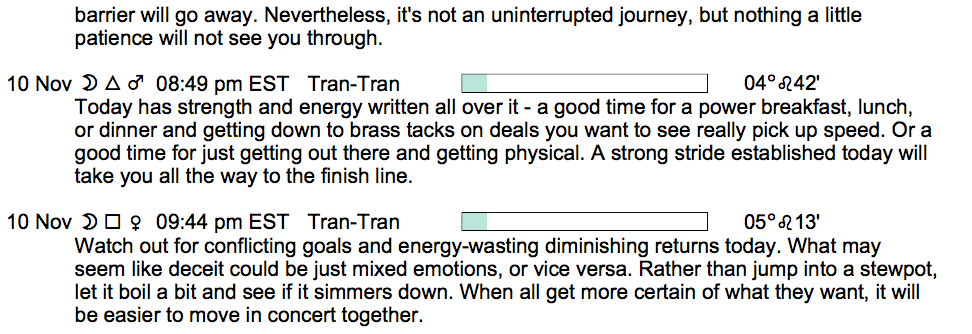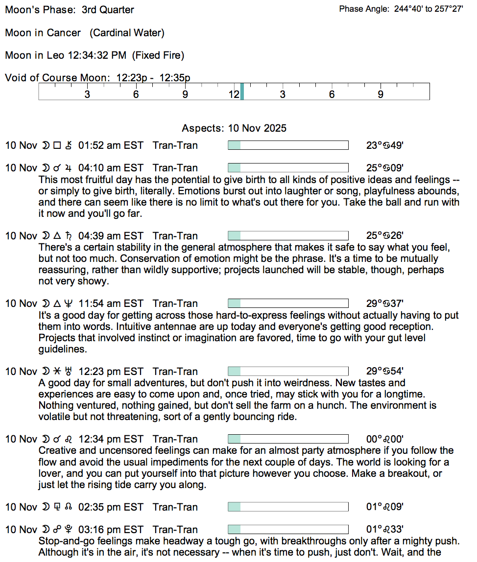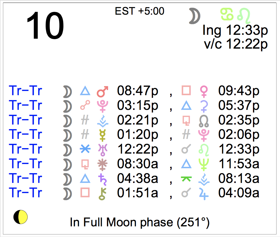 Planet Color Key: The longer the bar, the slower the aspecting planet, and the longer the duration of the planet’s transit.