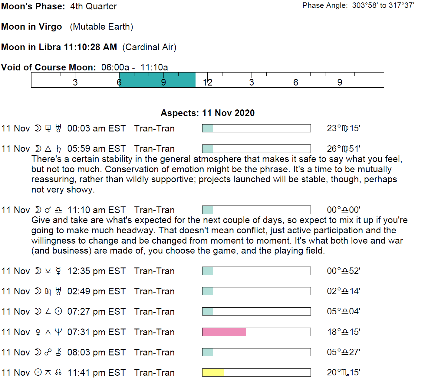 Planet Color Key: The longer the bar, the slower the aspecting planet, and the longer the duration of the planet’s transit.