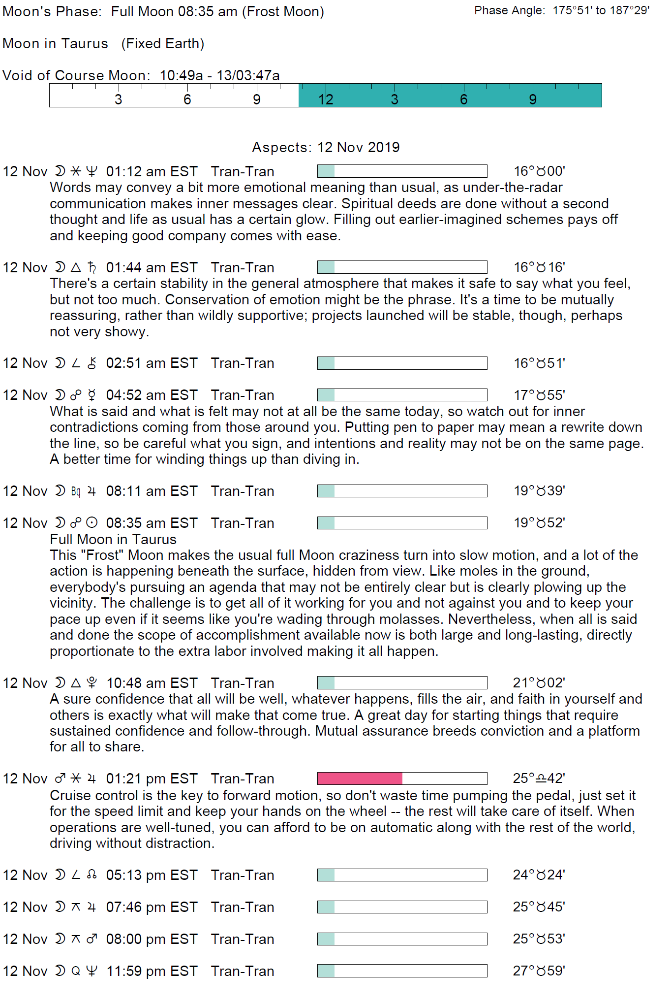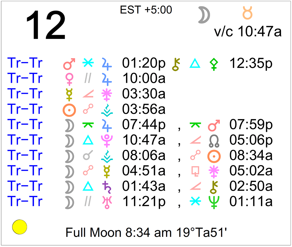 - The Full Moon occurs today in the sign of Taurus at 8:34 AM.