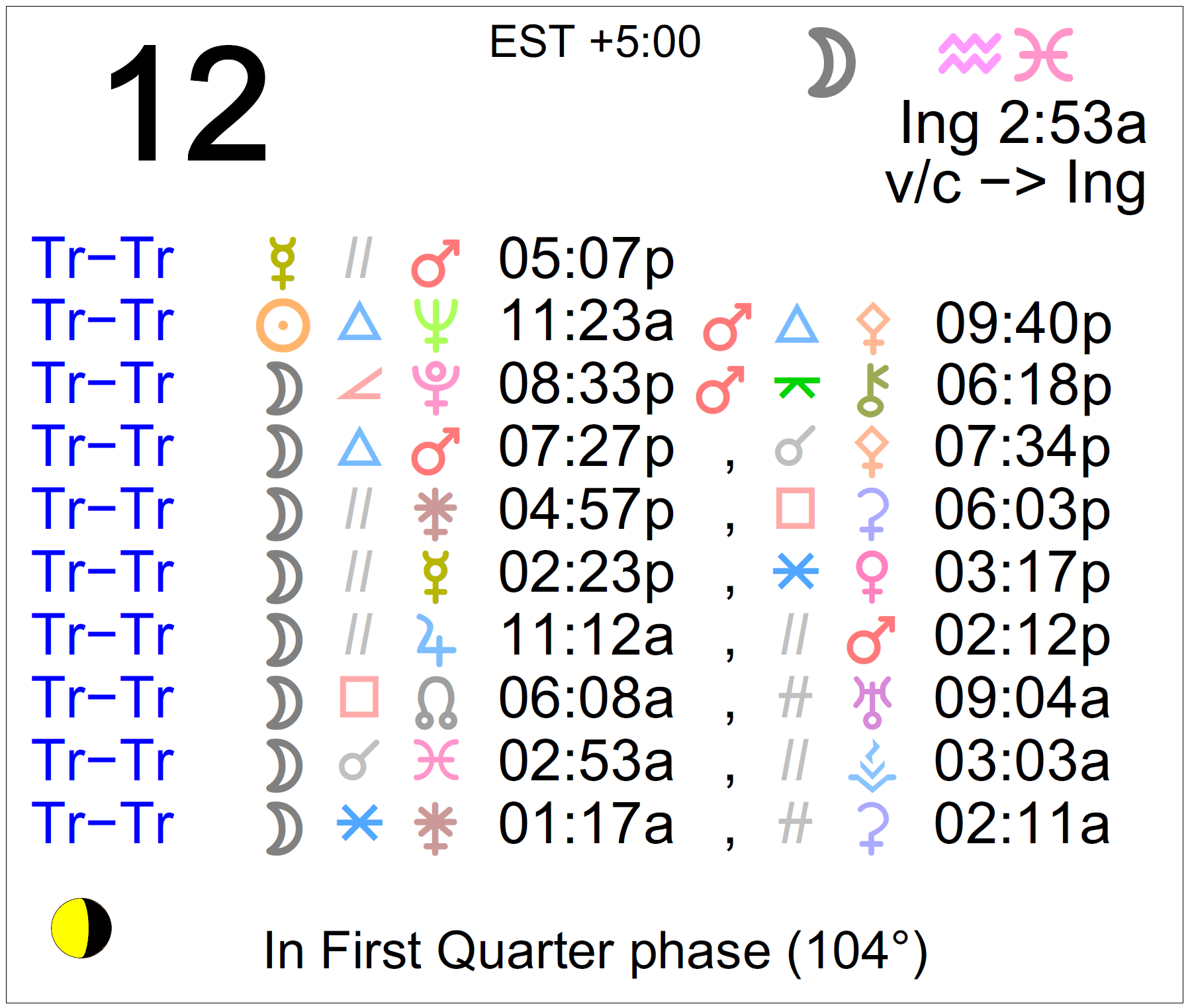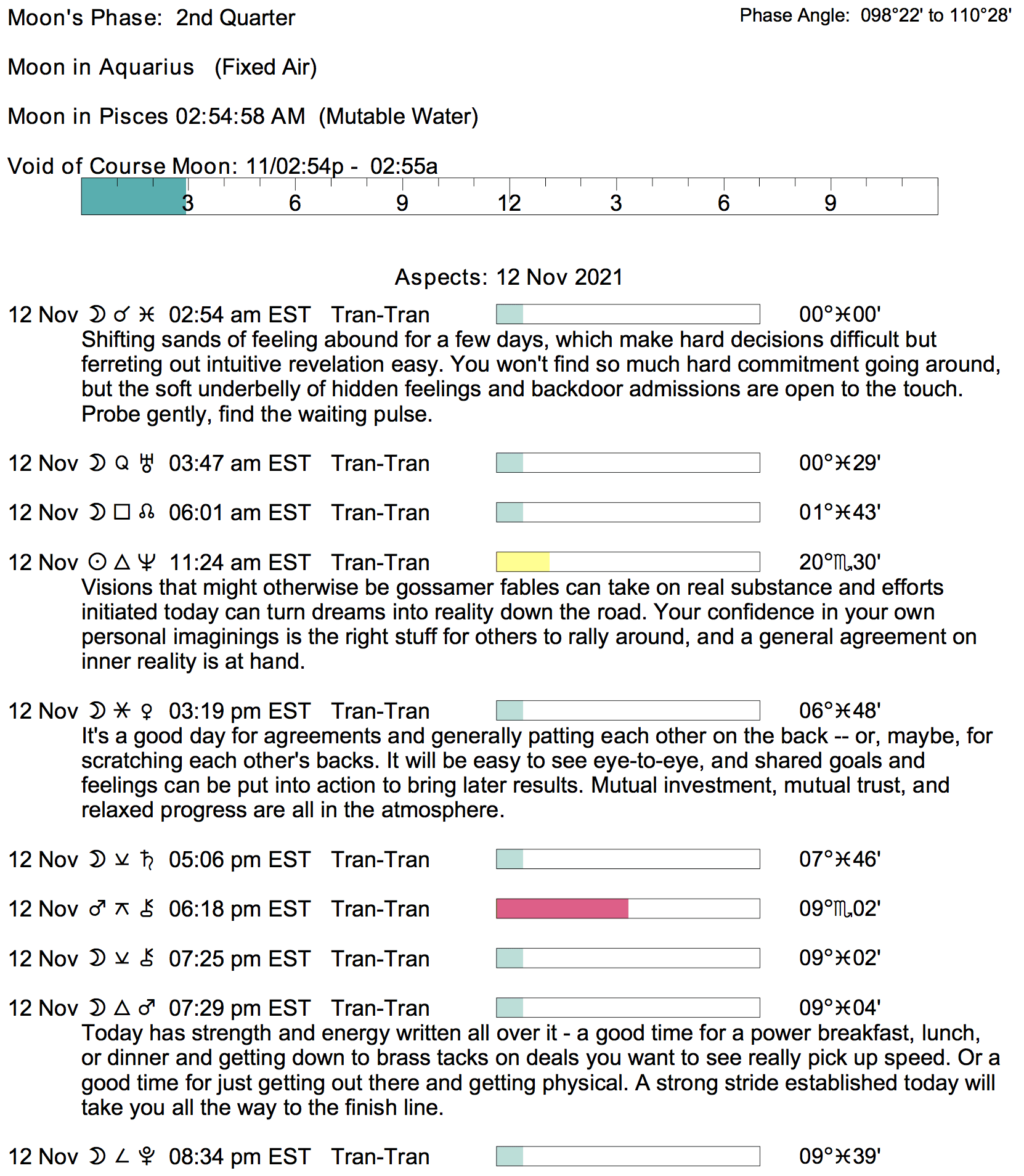 Planet Color Key: The longer the bar, the slower the aspecting planet, and the longer the duration of the planet’s transit.