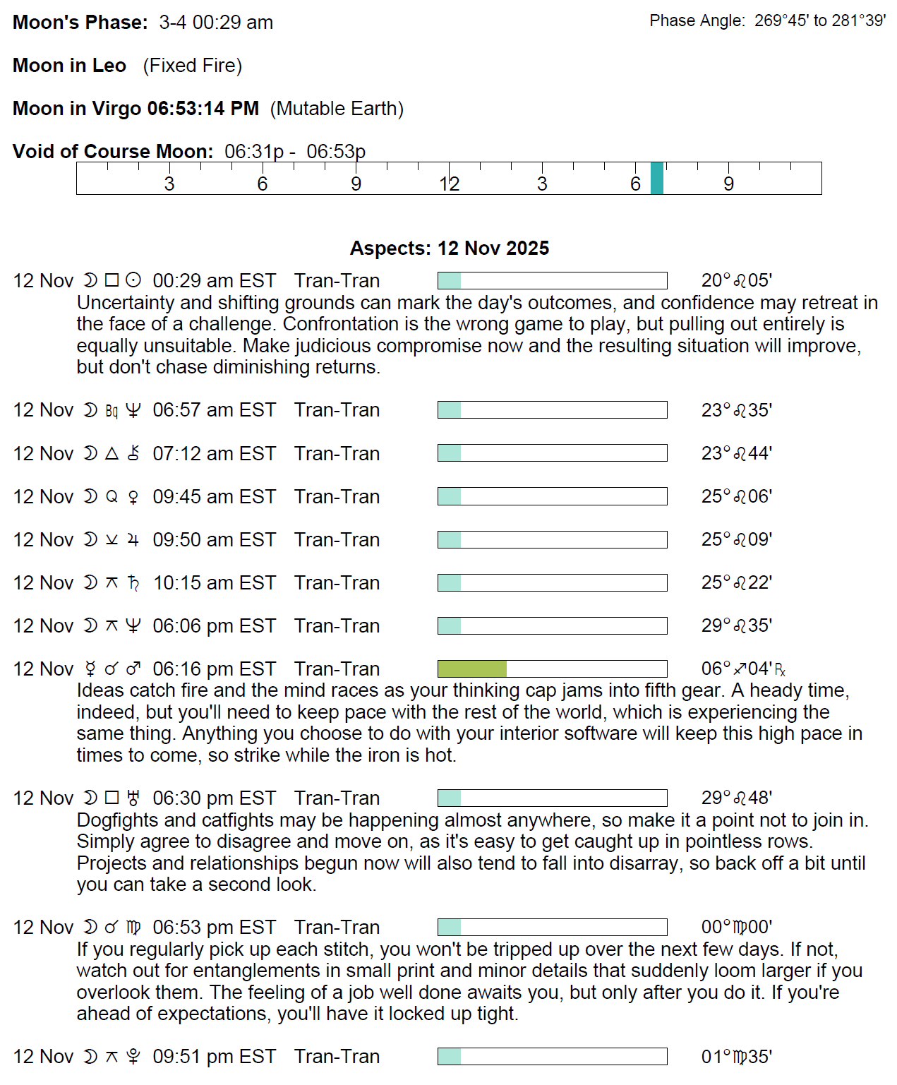 Planet Color Key: The longer the bar, the slower the aspecting planet, and the longer the duration of the planet’s transit.