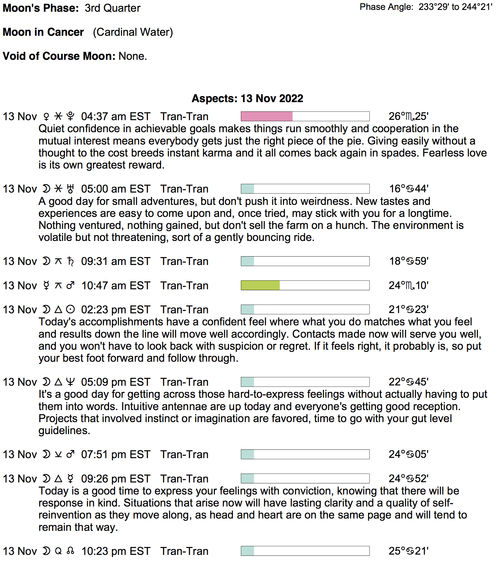 Planet Color Key: The longer the bar, the slower the aspecting planet, and the longer the duration of the planet’s transit.