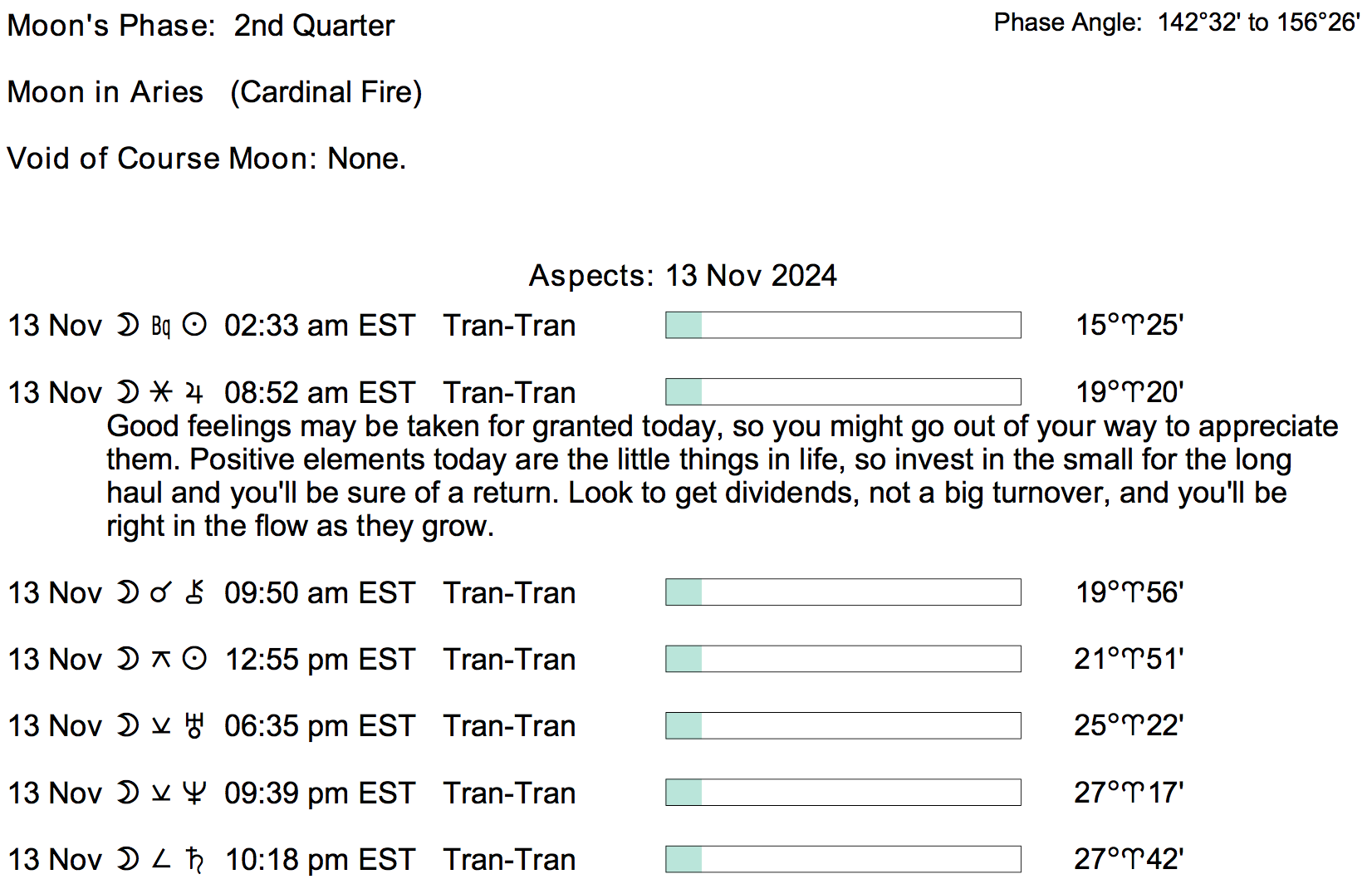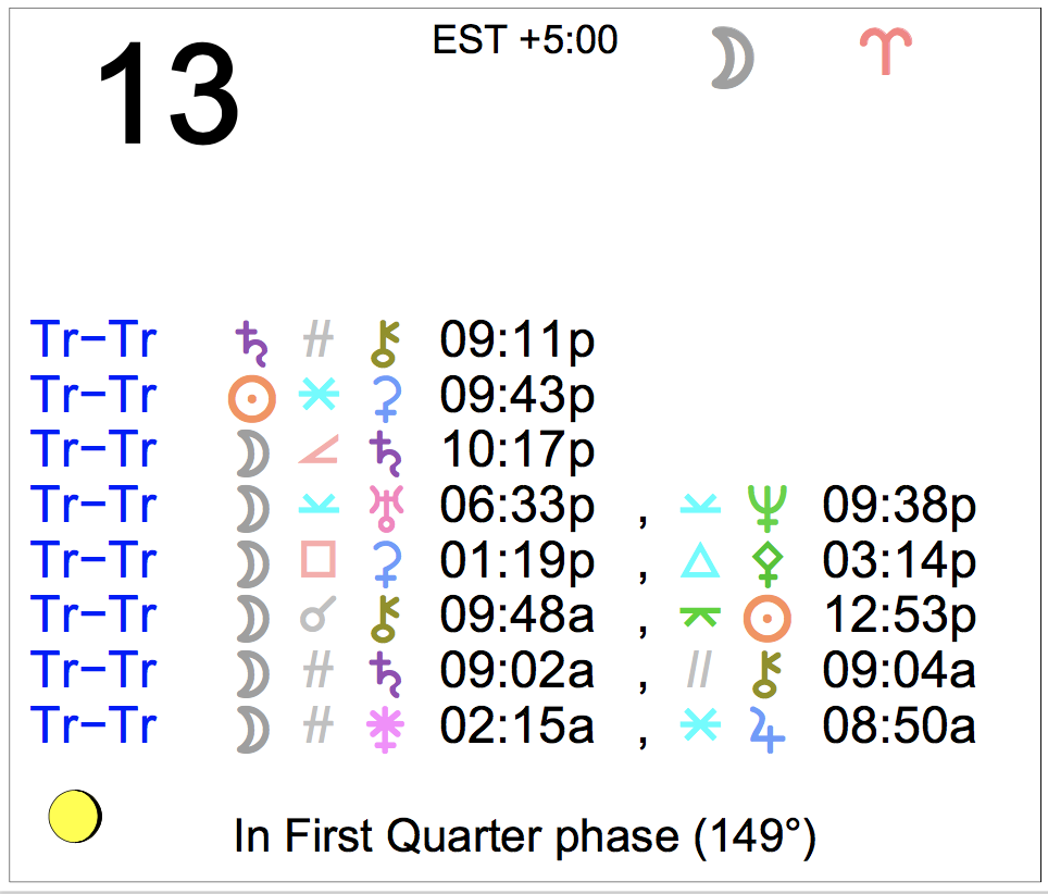 Planet Color Key: The longer the bar, the slower the aspecting planet, and the longer the duration of the planet’s transit.