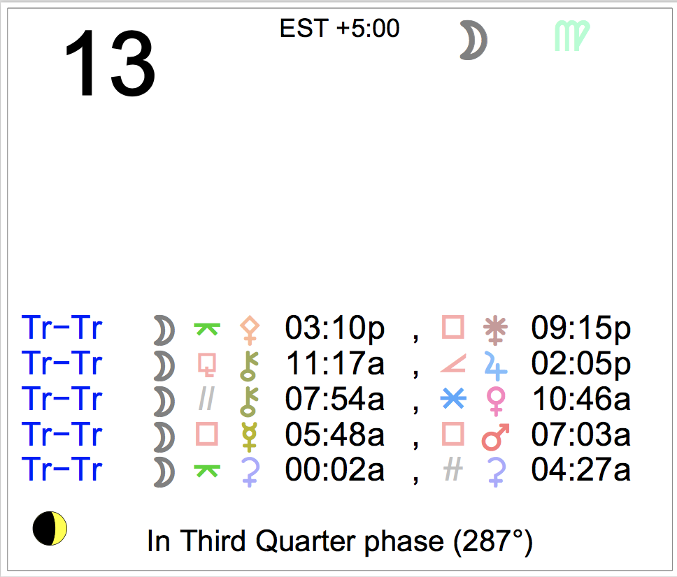 Planet Color Key: The longer the bar, the slower the aspecting planet, and the longer the duration of the planet’s transit.