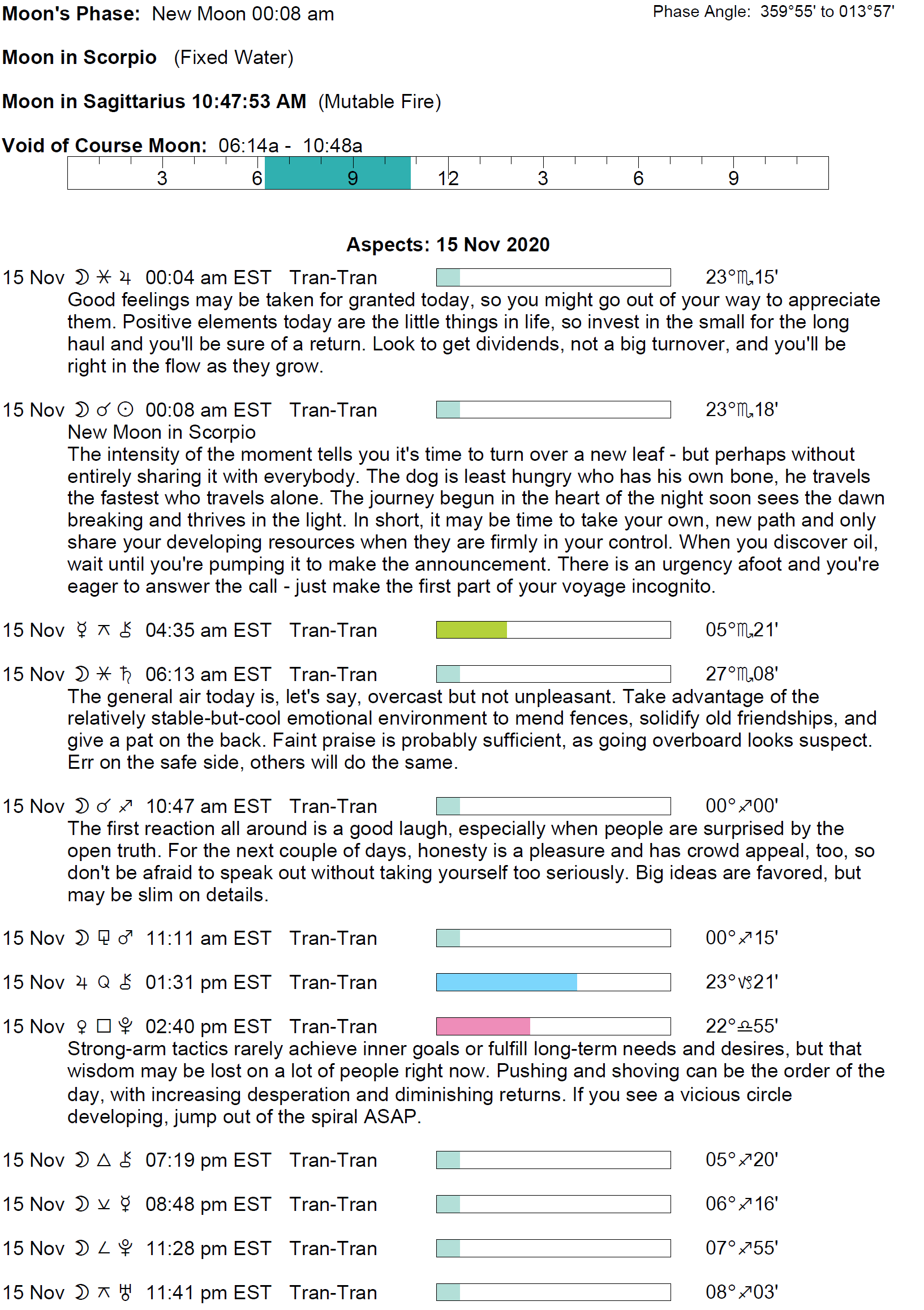 Planet Color Key: The longer the bar, the slower the aspecting planet, and the longer the duration of the planet’s transit.