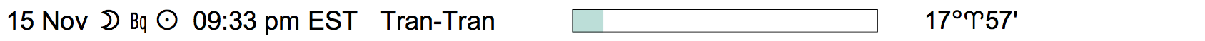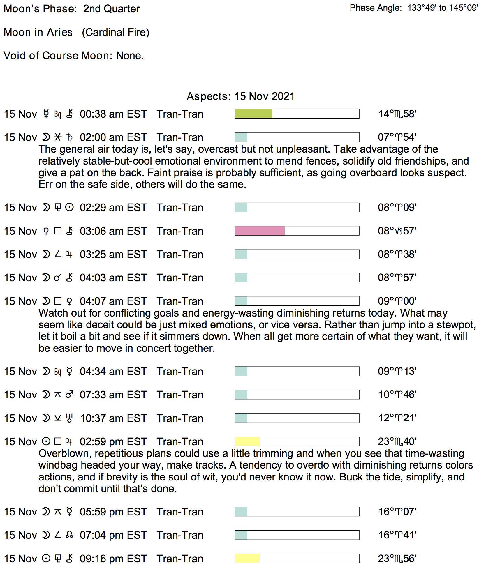 Planet Color Key: The longer the bar, the slower the aspecting planet, and the longer the duration of the planet’s transit.