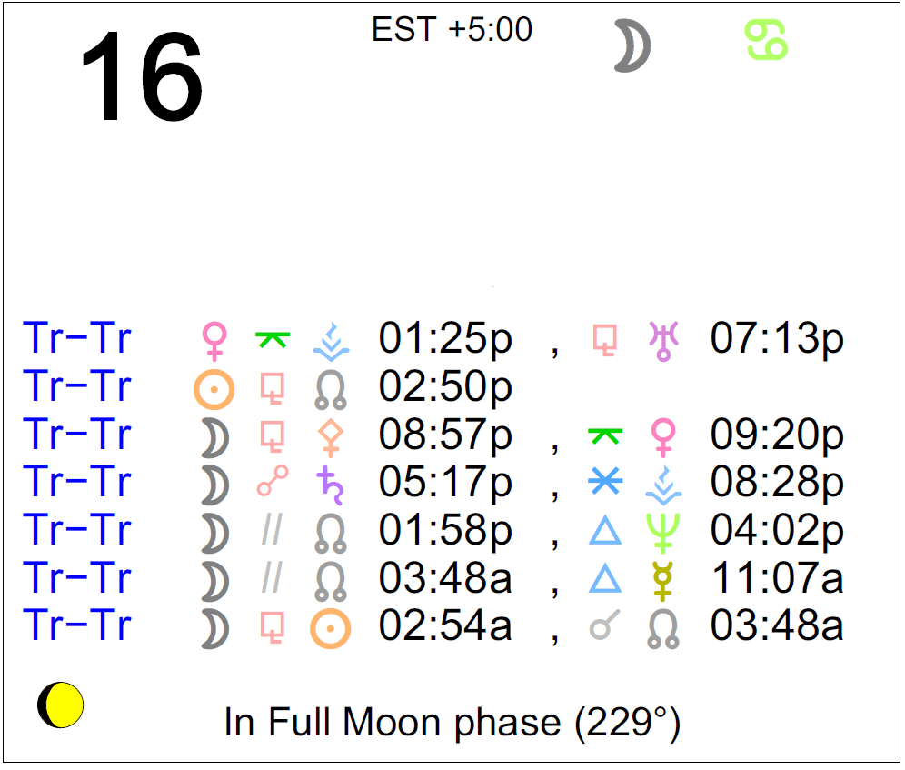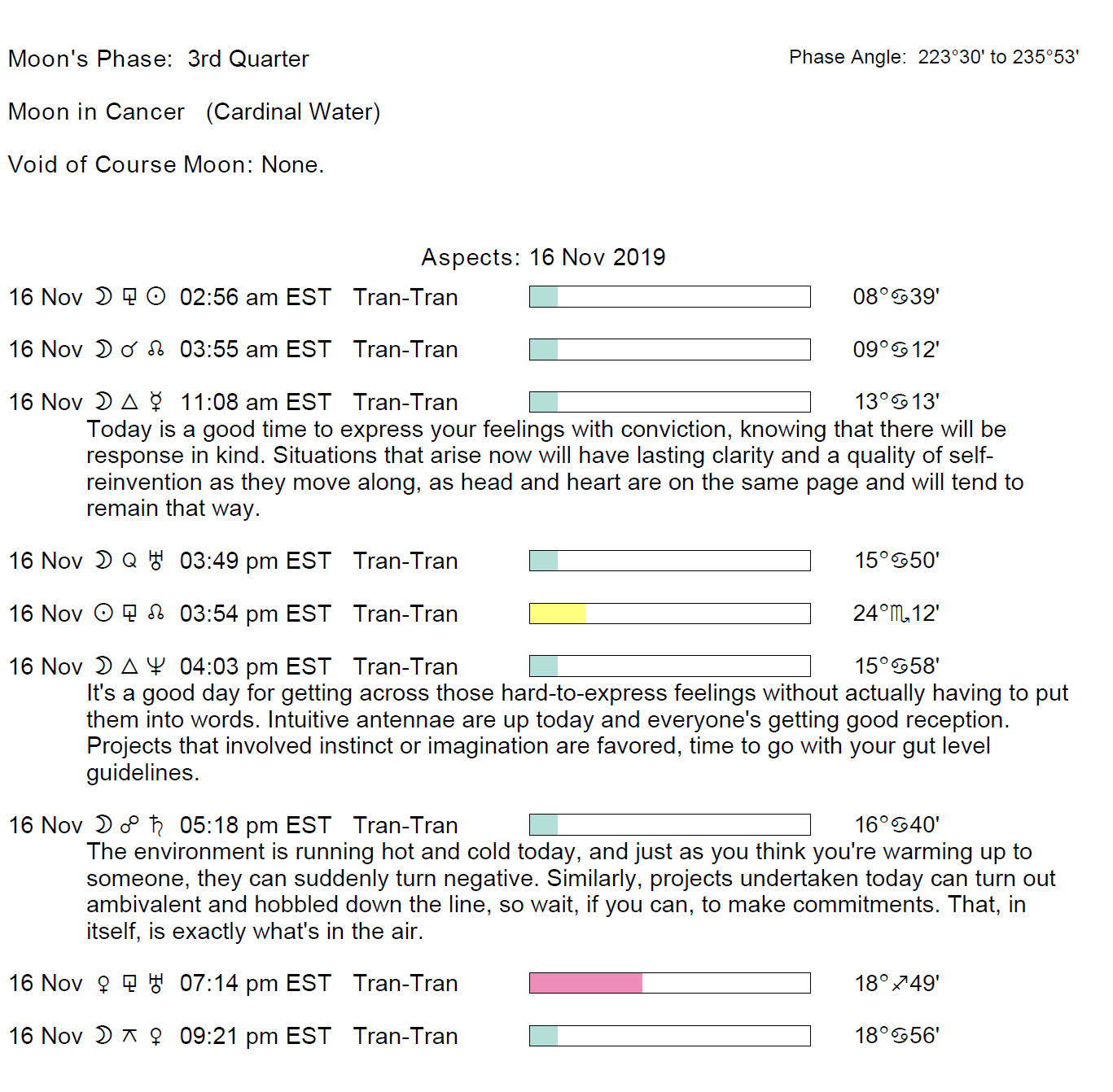 Planet Color Key: The longer the bar, the slower the aspecting planet and the longer the duration of the planet’s transit.