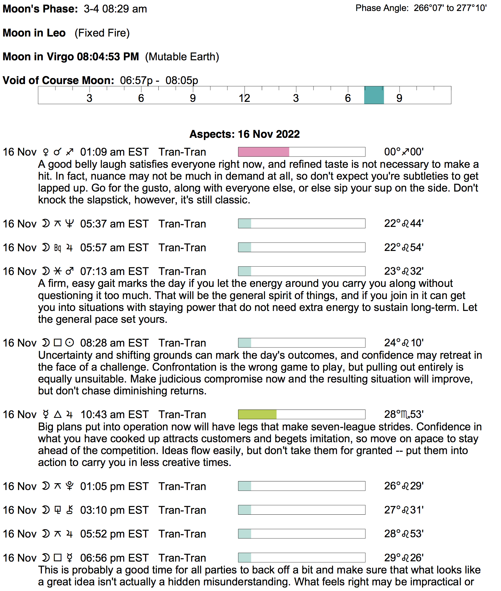 Planet Color Key: The longer the bar, the slower the aspecting planet, and the longer the duration of the planet’s transit.