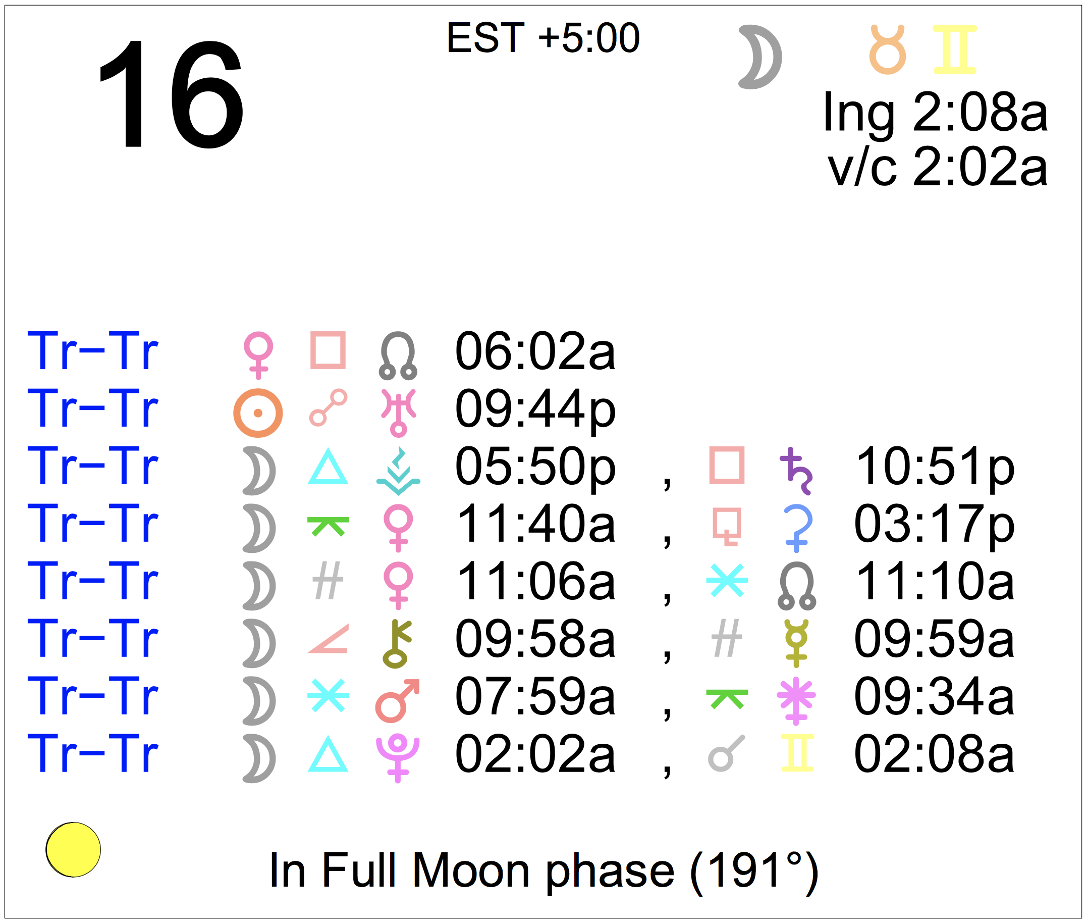 Planet Color Key: The longer the bar, the slower the aspecting planet, and the longer the duration of the planet’s transit.