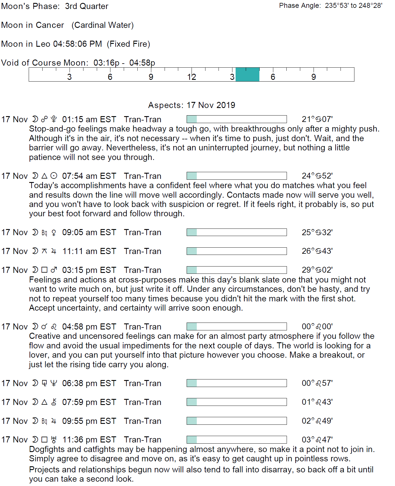 Planet Color Key: The longer the bar, the slower the aspecting planet and the longer the duration of the planet’s transit.