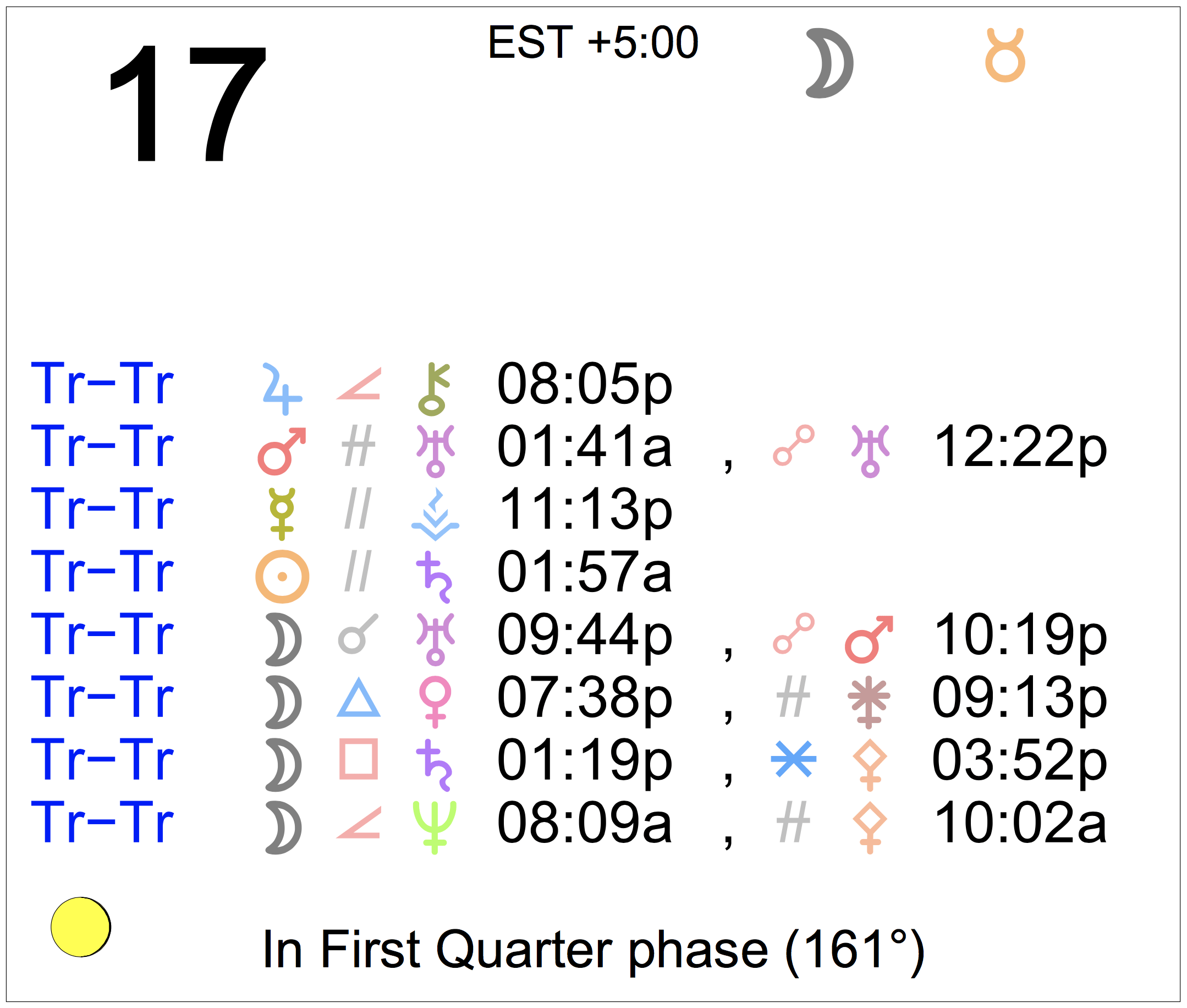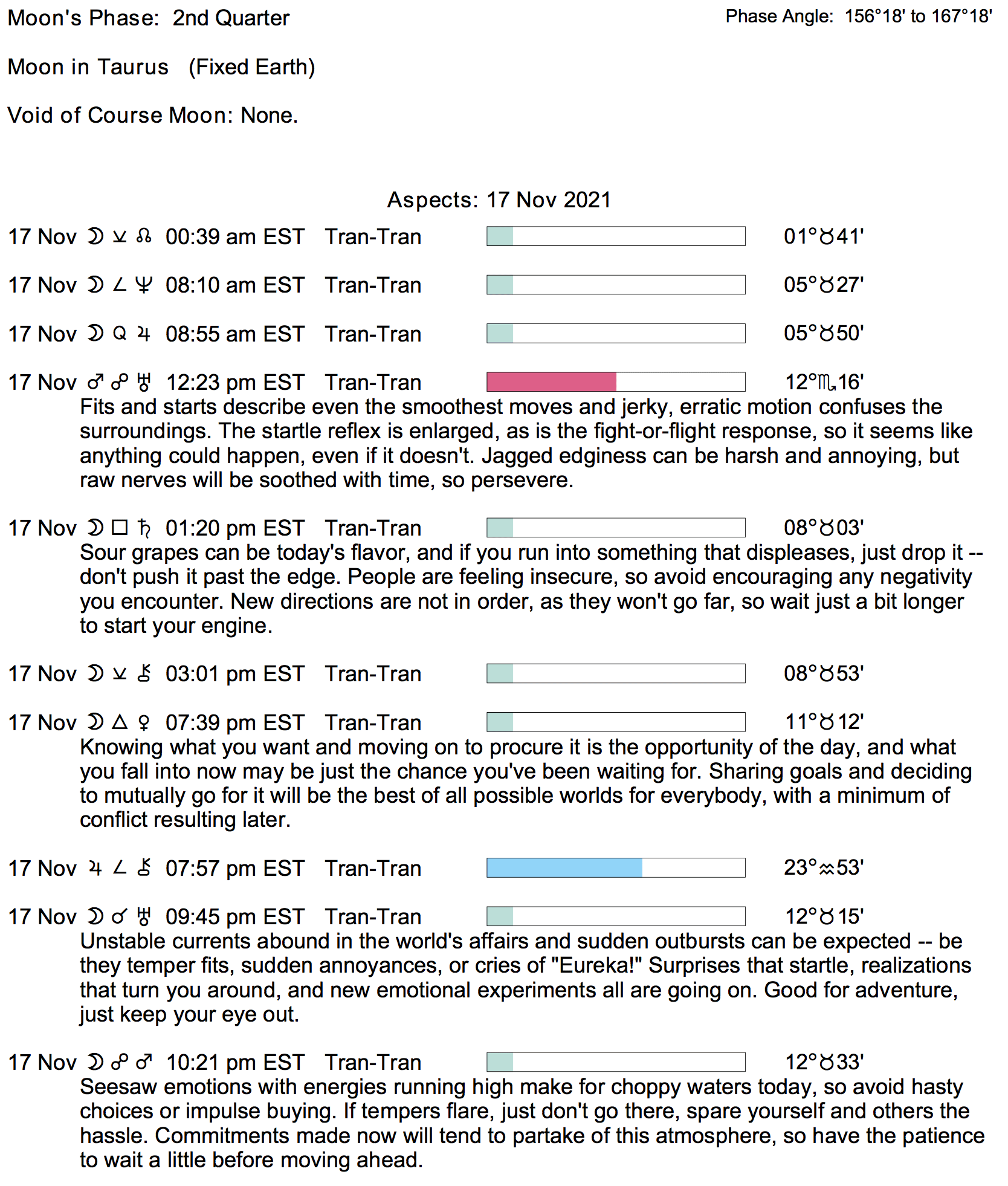 Planet Color Key: The longer the bar, the slower the aspecting planet, and the longer the duration of the planet’s transit.