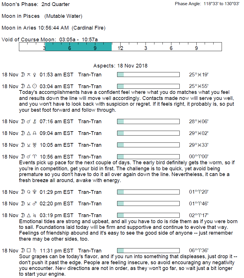 Planet Color Key: The longer the bar, the slower the aspecting planet and the longer the duration of the planet’s transit.