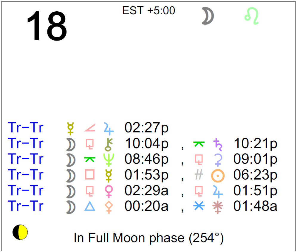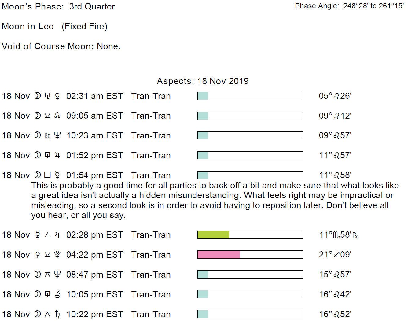 Planet Color Key: The longer the bar, the slower the aspecting planet and the longer the duration of the planet’s transit.