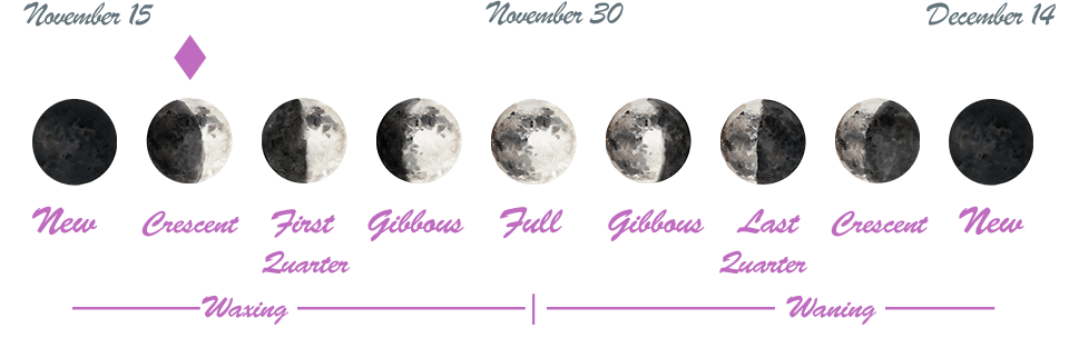 - The New Moon occurred on the 15th in the sign of Scorpio, and the First Quarter Moon will occur on the 21st.