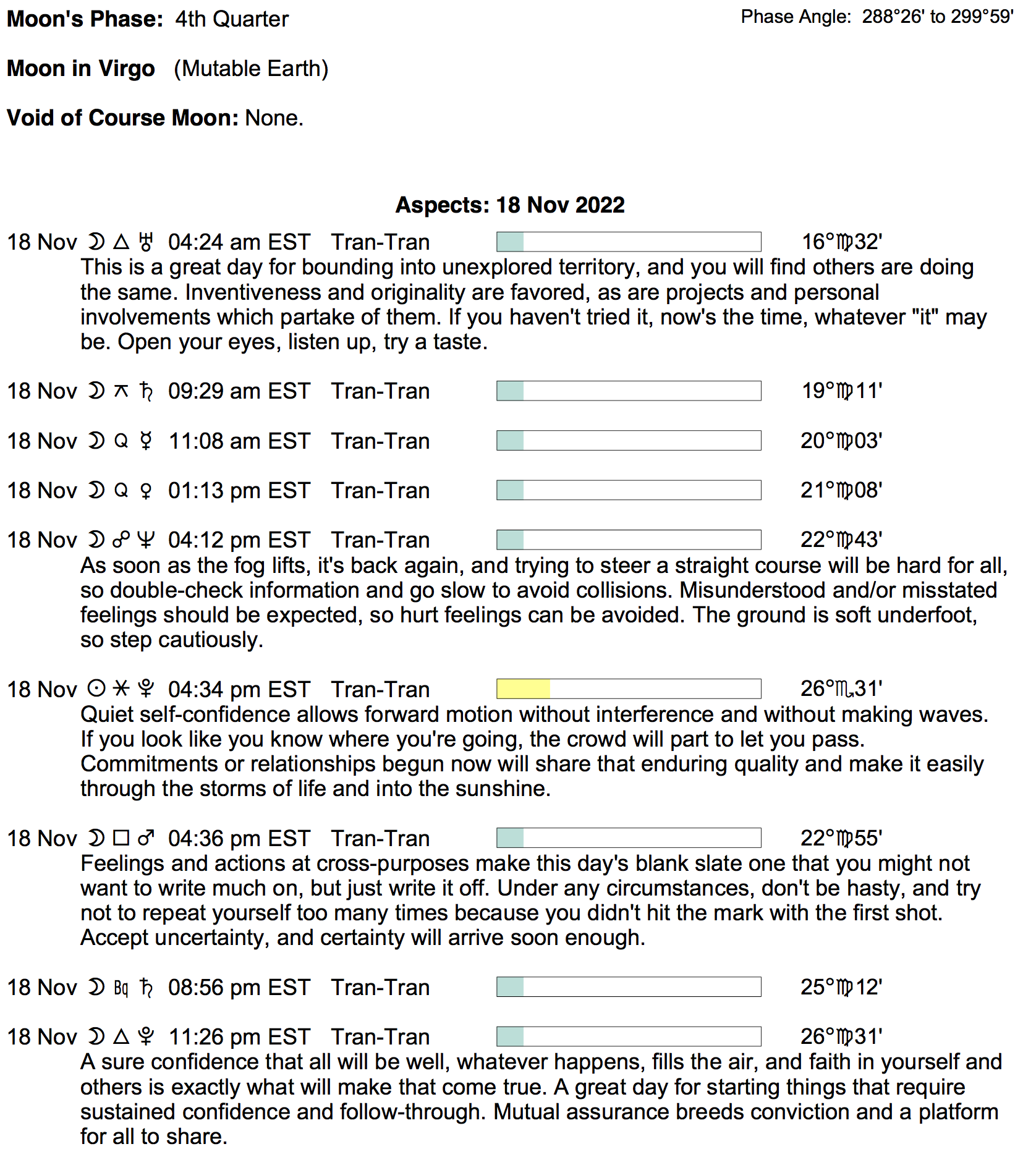 Planet Color Key: The longer the bar, the slower the aspecting planet, and the longer the duration of the planet’s transit.