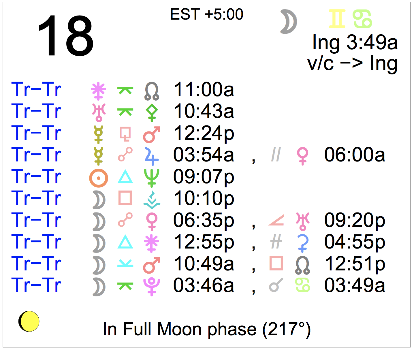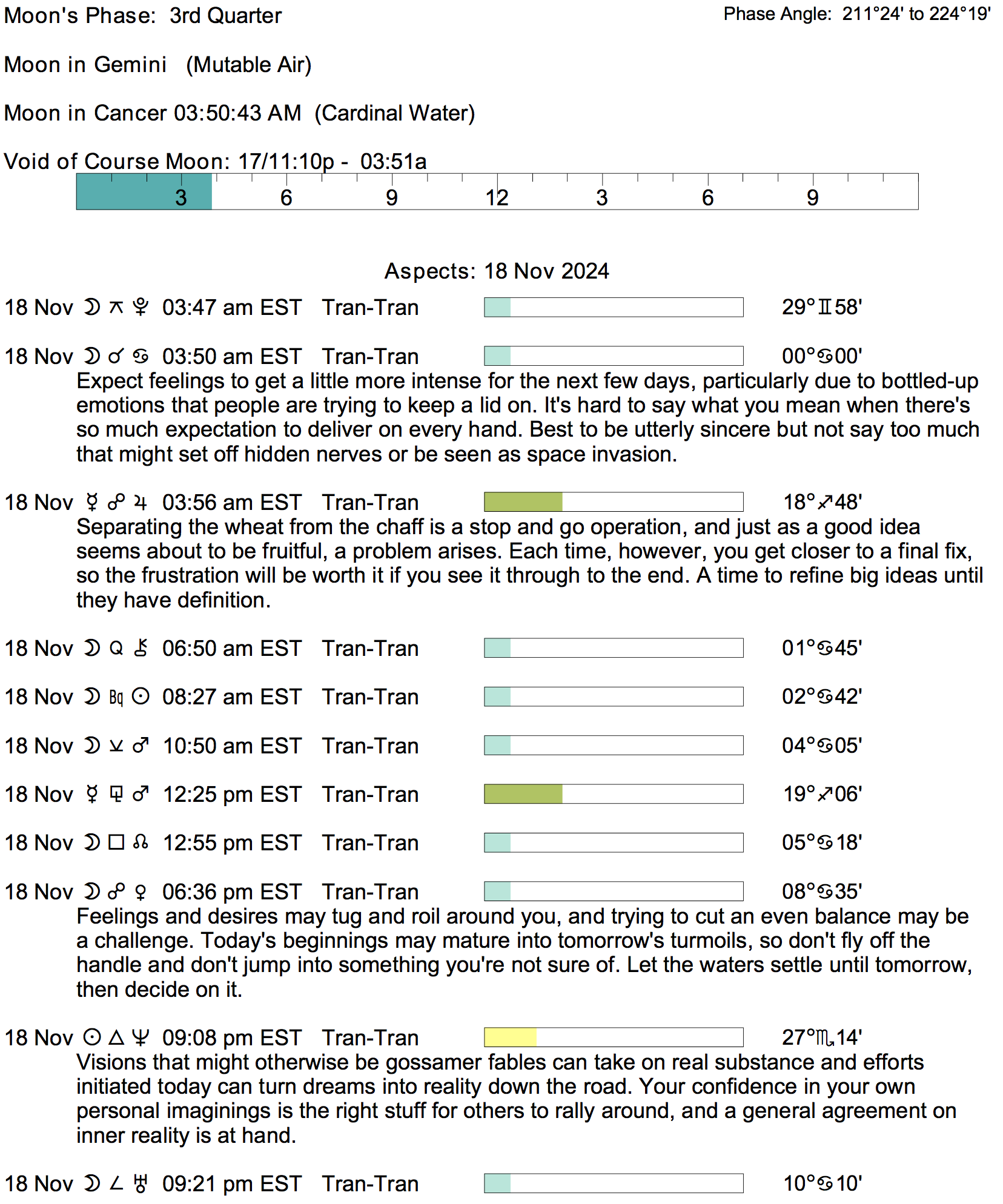 Planet Color Key: The longer the bar, the slower the aspecting planet, and the longer the duration of the planet’s transit.