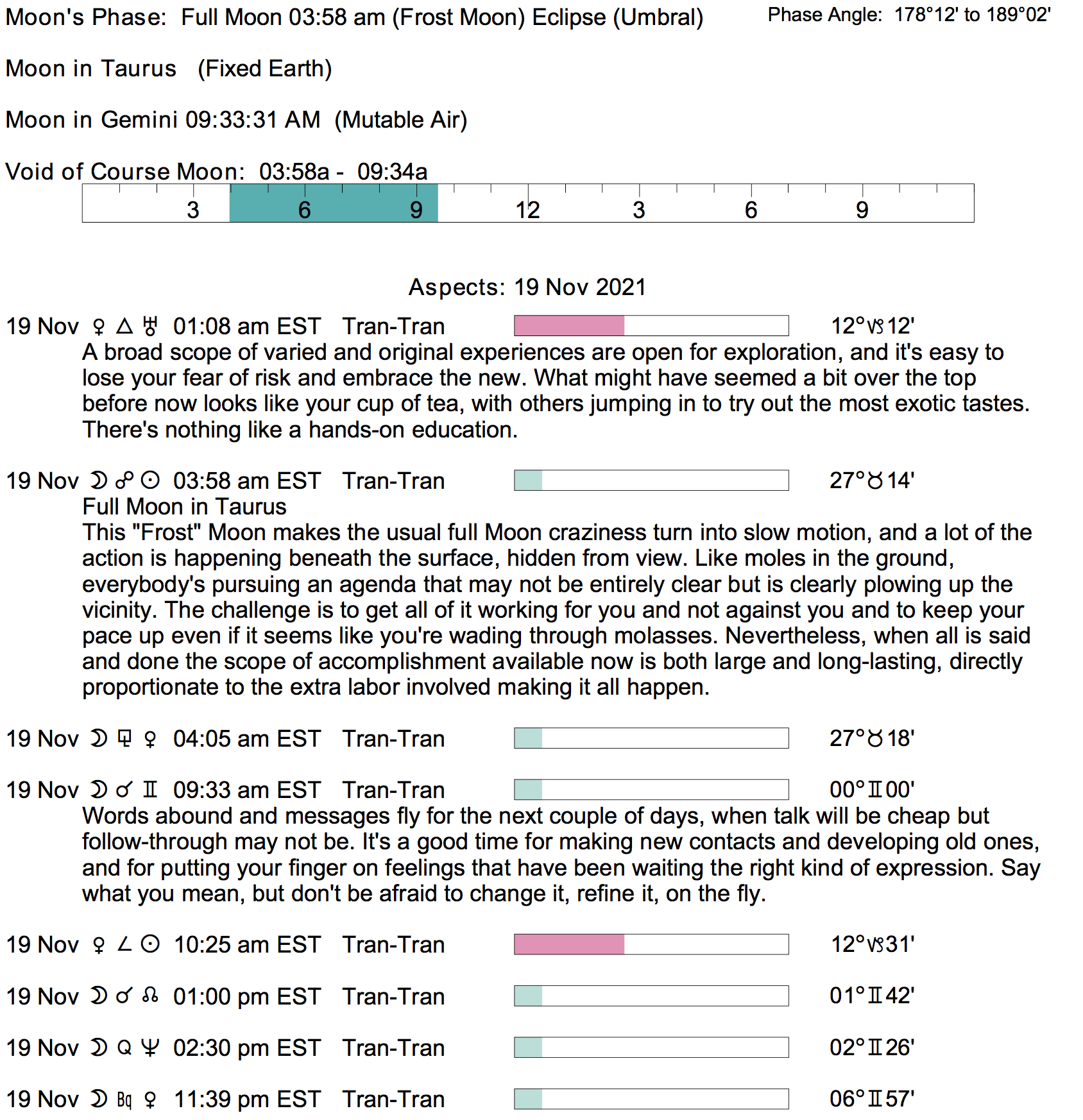 - The Full Moon/Lunar Eclipse occurs today at 3:57 AM in the sign of Taurus.