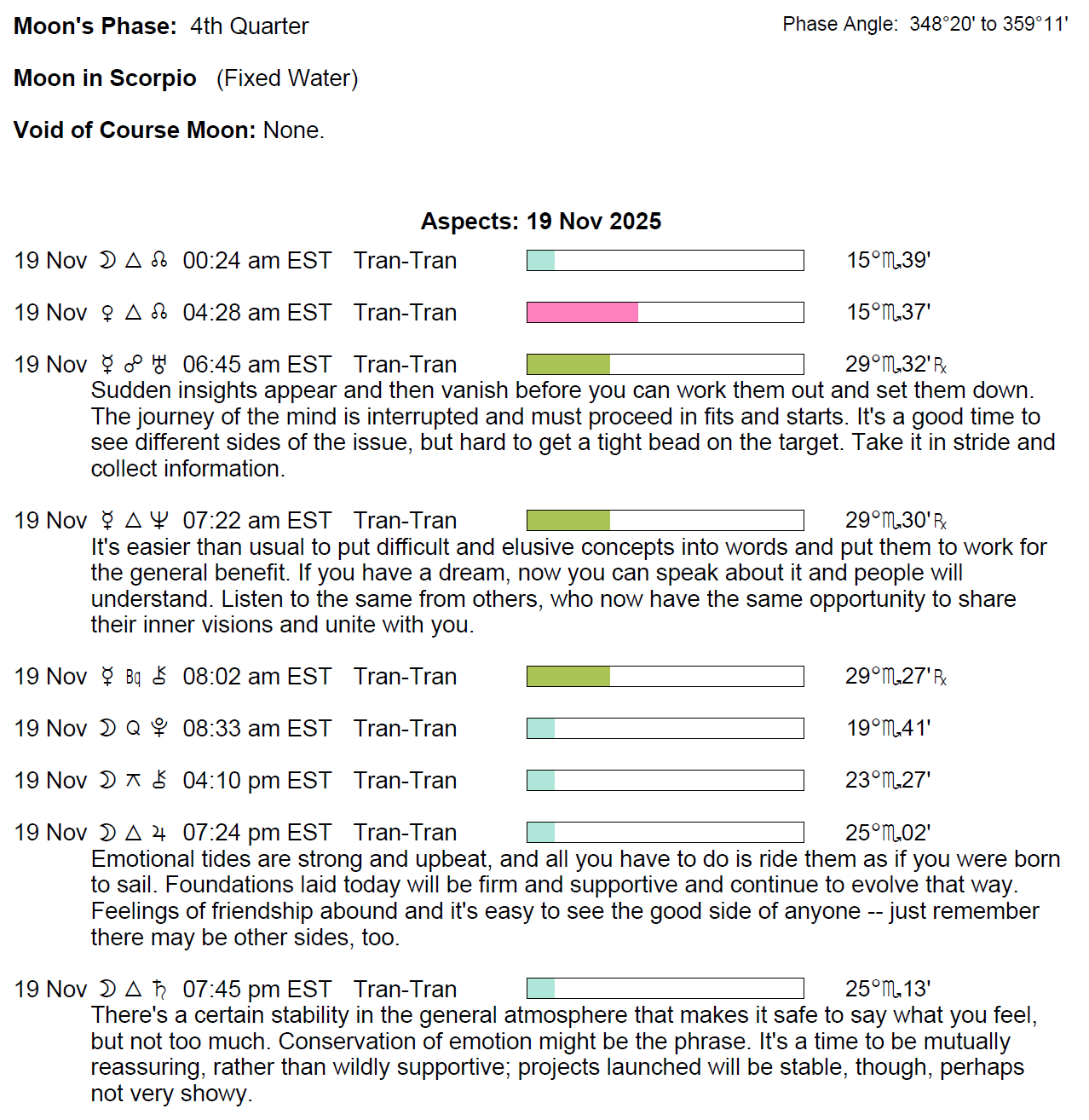 - The Last Quarter Moon occurred on the 12th, and the New Moon will happen early tomorrow in the sign of Scorpio.