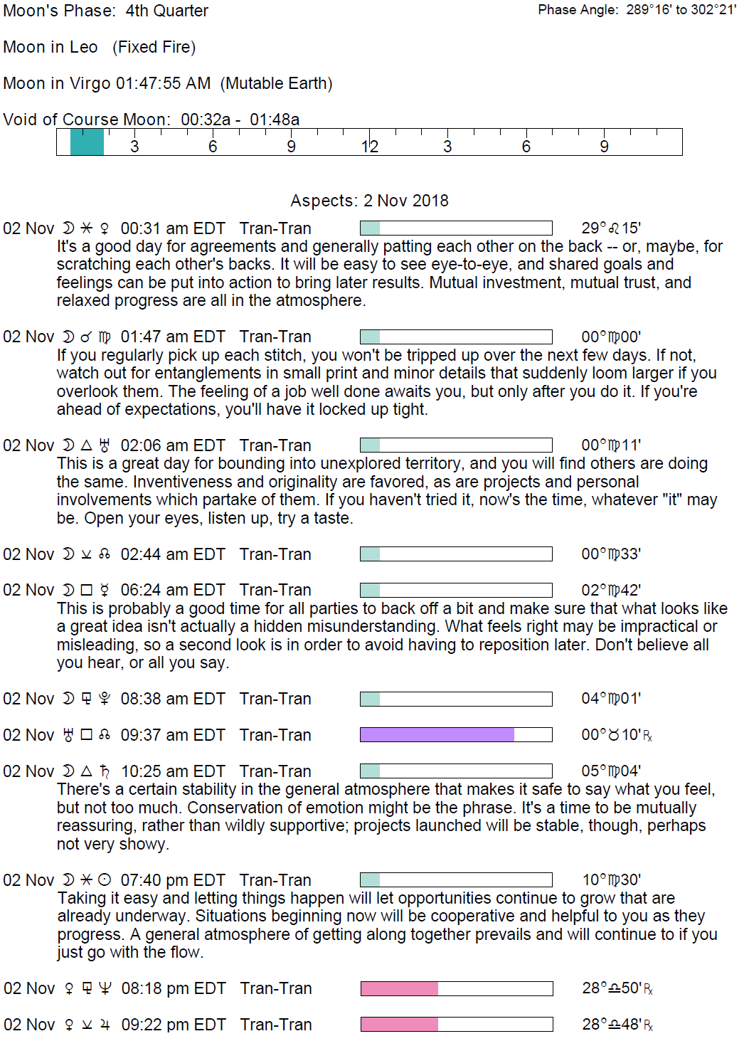 Planet Color Key: The longer the bar, the slower the aspecting planet and the longer the duration of the planet’s transit.