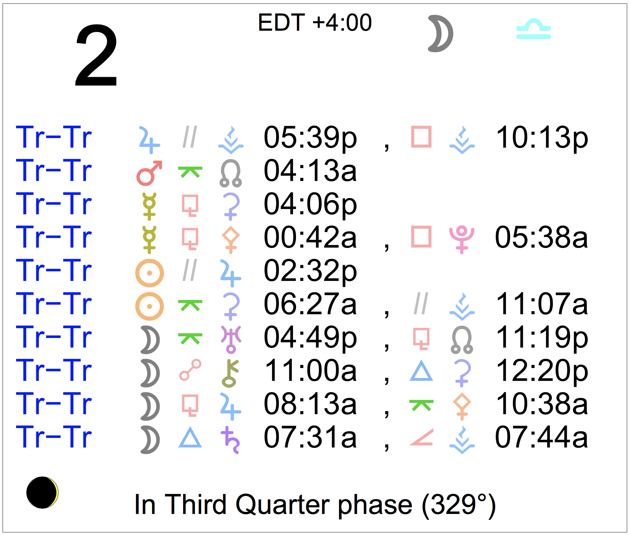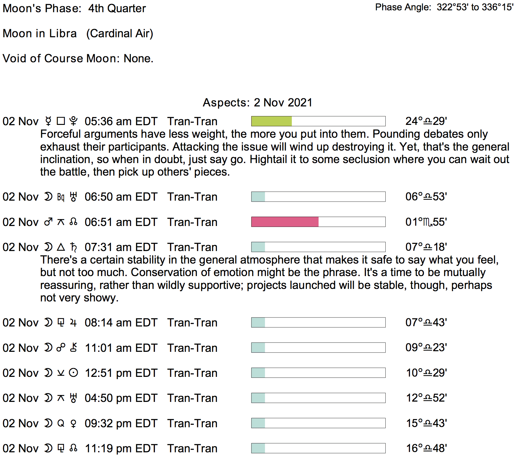 Planet Color Key: The longer the bar, the slower the aspecting planet, and the longer the duration of the planet’s transit.