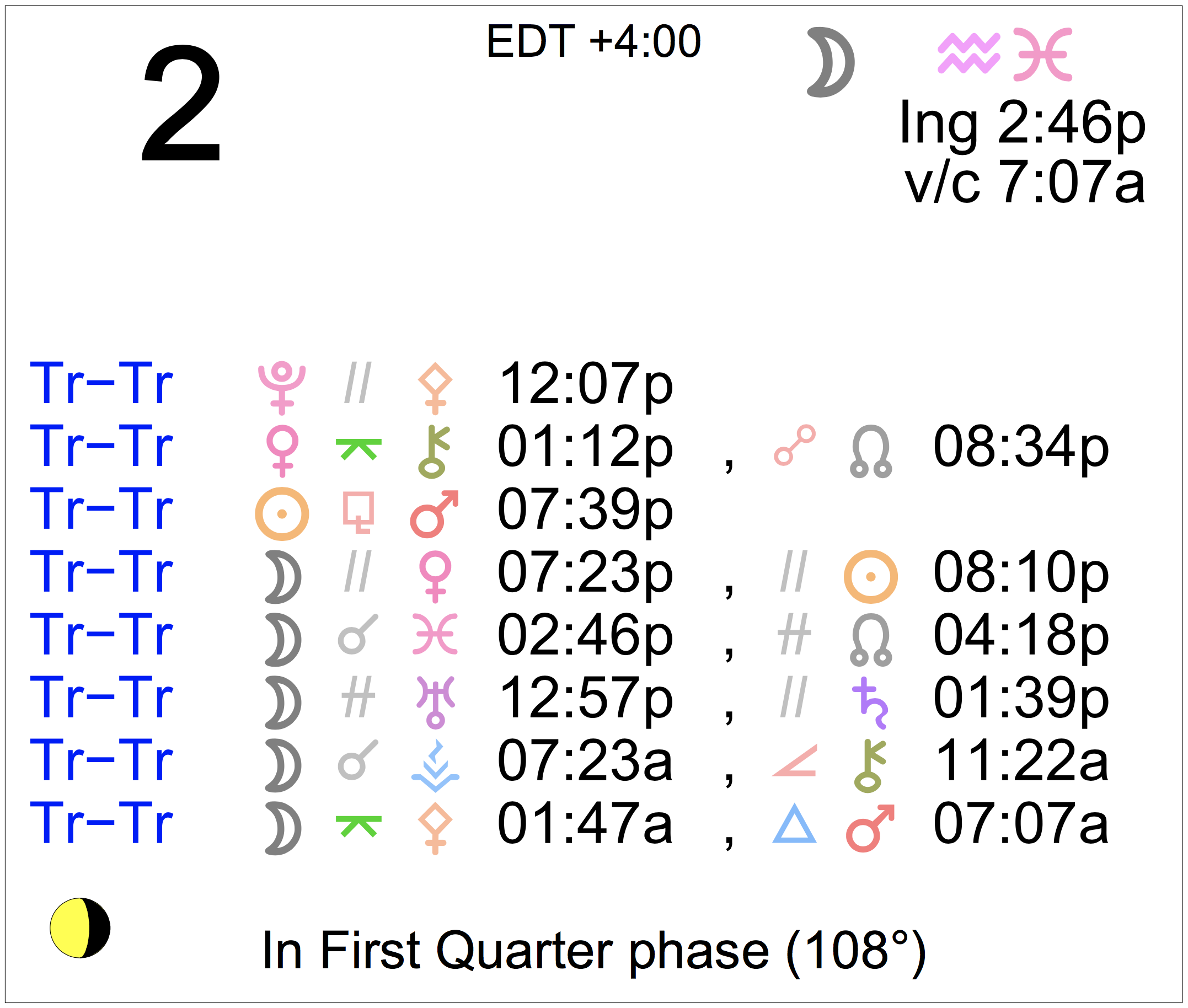 - The Moon is in Aquarius until 2:46 PM, after which the Moon is in Pisces.