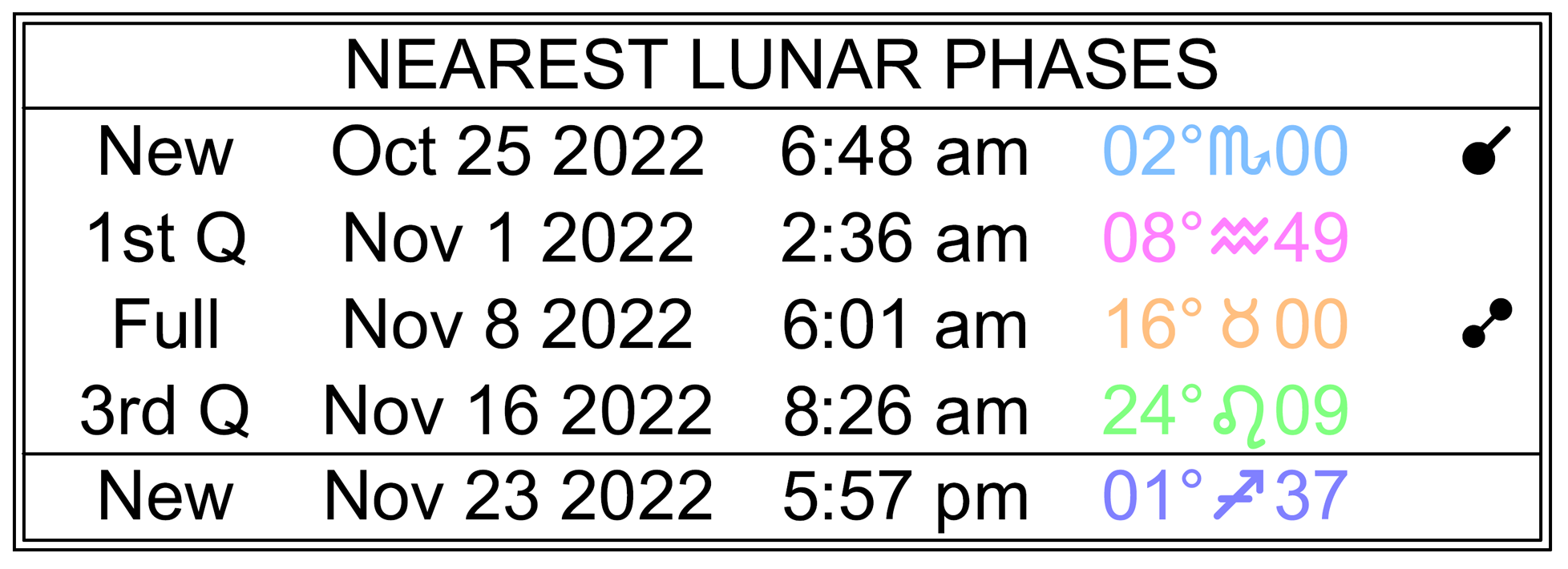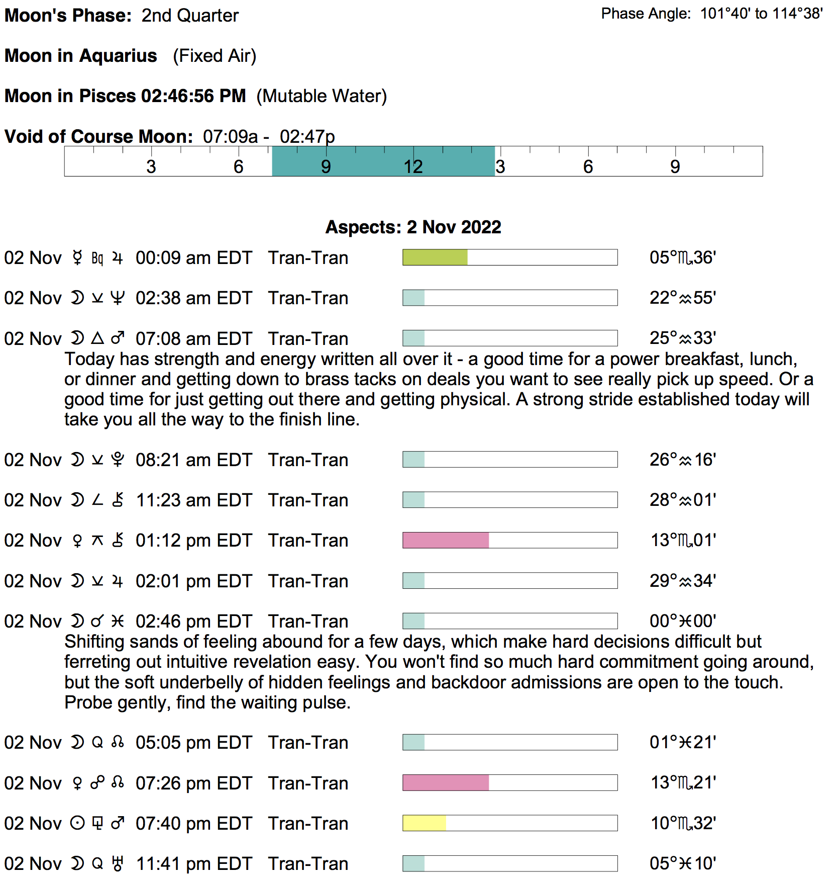 Planet Color Key: The longer the bar, the slower the aspecting planet, and the longer the duration of the planet’s transit.