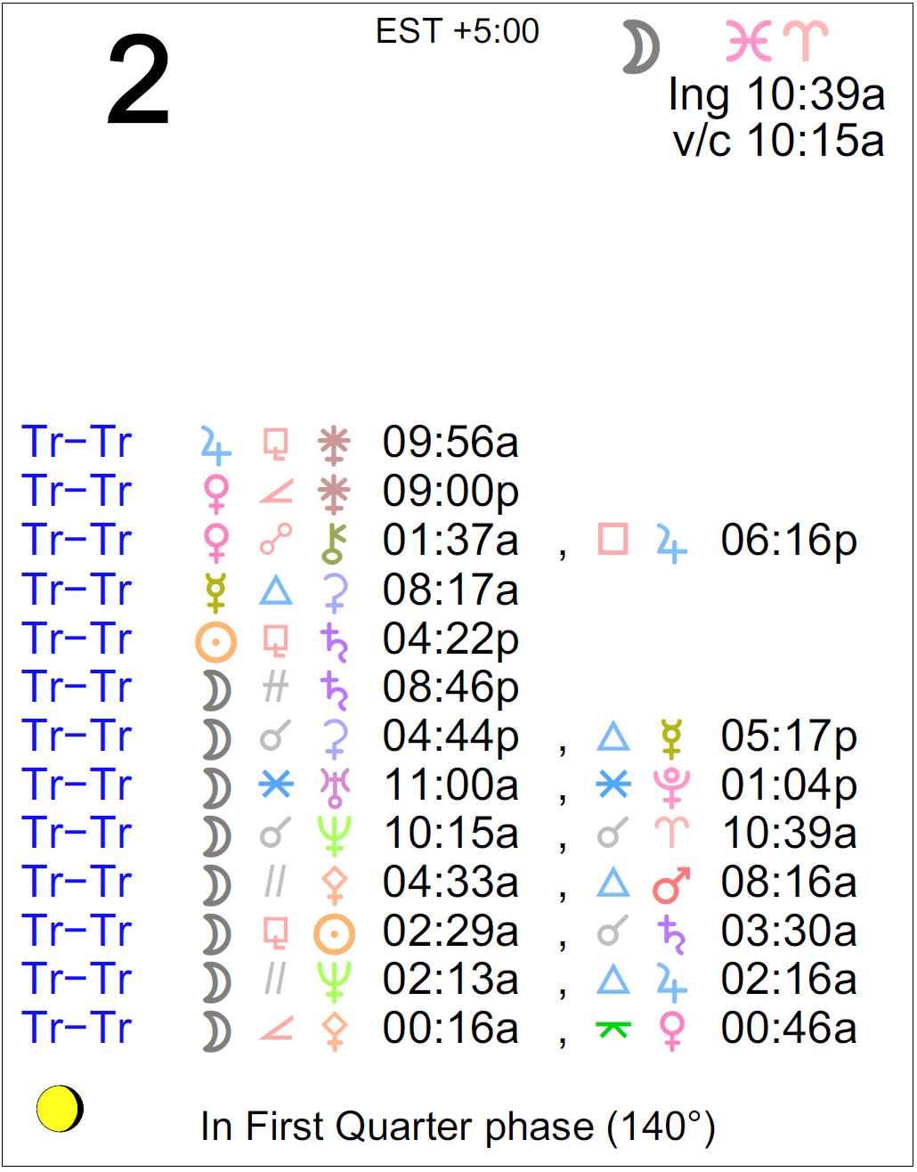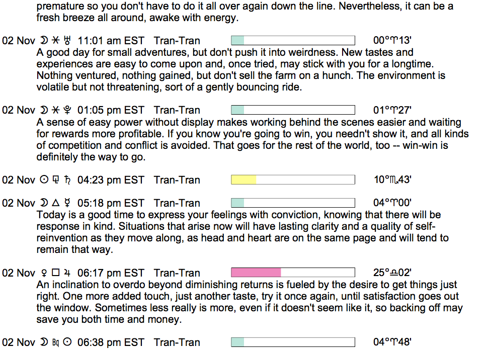 Planet Color Key: The longer the bar, the slower the aspecting planet, and the longer the duration of the planet’s transit.