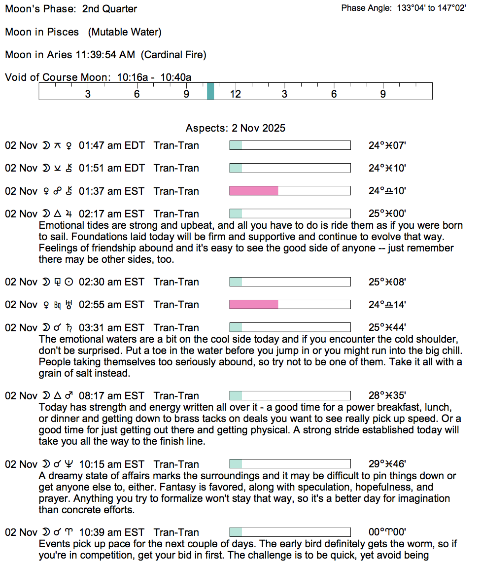 - A void Moon period occurs today from 10:15 AM to 10:39 AM.