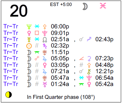 If you’re astrologically inclined and interested in the details of the Astrology of today, here are some of the factors considered in the forecasts (for the astrology of the week, see This Week in Astrology):